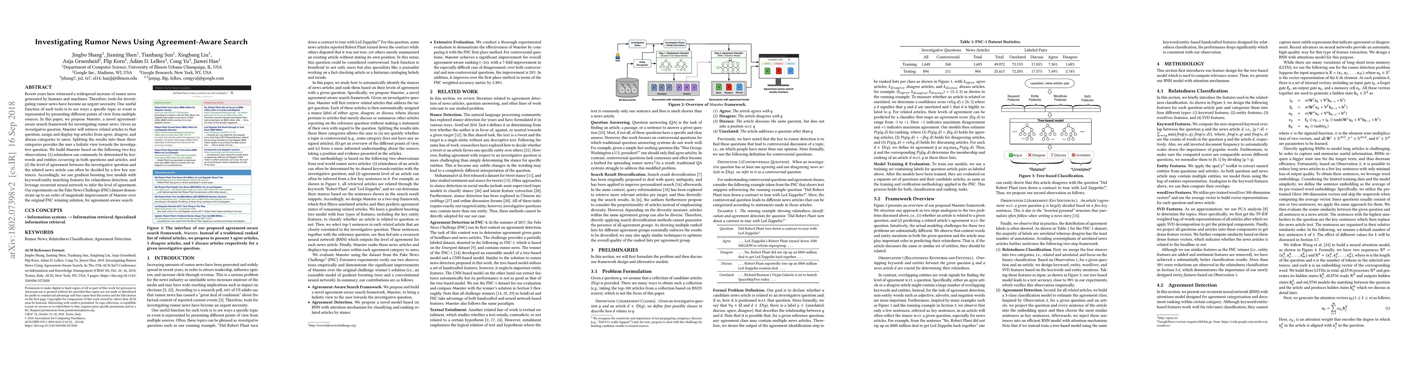 This paper introduces Maester, an agreement-aware search framework for investigating rumor news, which categorizes retrieved articles into agree, disagree, and discuss based on key sentences. Experiments on the Fake News Challenge dataset show significant improvements over previous methods.