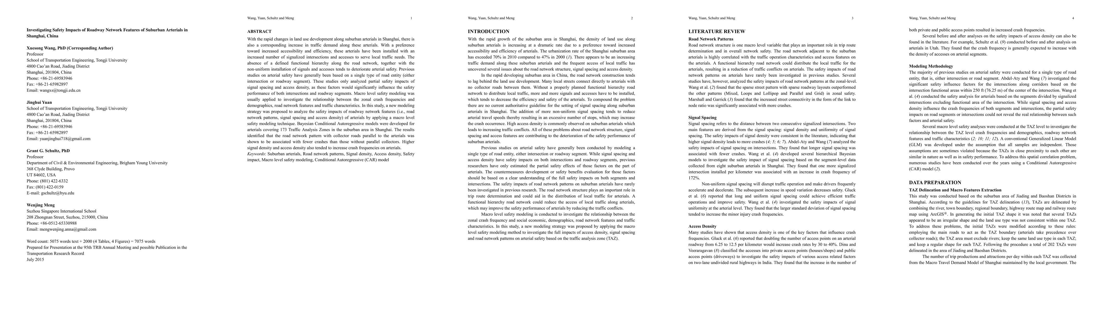 This study investigates the safety impacts of suburban arterial road network features in Shanghai using a new macro level safety modeling approach. The findings suggest that road network patterns with parallel collector roads correlate with fewer crashes, while higher signal and access densities tend to increase crash frequencies.