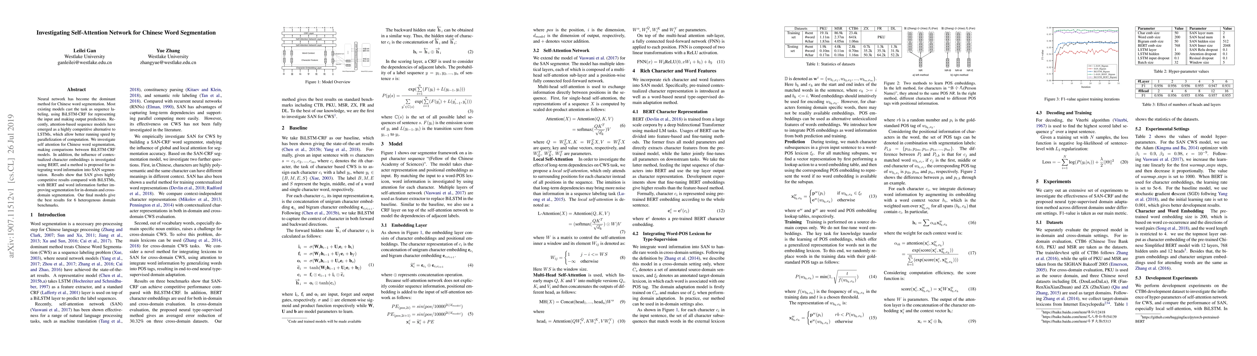 This paper investigates self-attention networks (SAN) for Chinese word segmentation, comparing them to BiLSTM-CRF models. The study finds that SANs achieve competitive results with further improvements from BERT embeddings and integrated word information, outperforming BiLSTMs across six domain benchmarks.