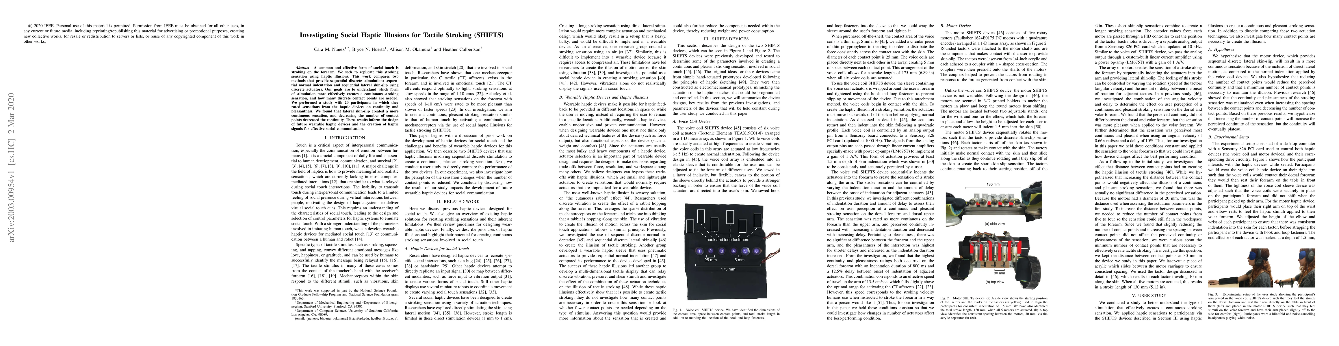 This study investigates two methods for replicating the sensation of social forearm stroking using haptic illusions: sequential normal indentation and sequential lateral skin-slip. Results from 20 participants indicate that lateral skin-slip creates a more continuous stroking sensation, while reducing contact points diminishes continuity, informing future wearable haptic device design.
