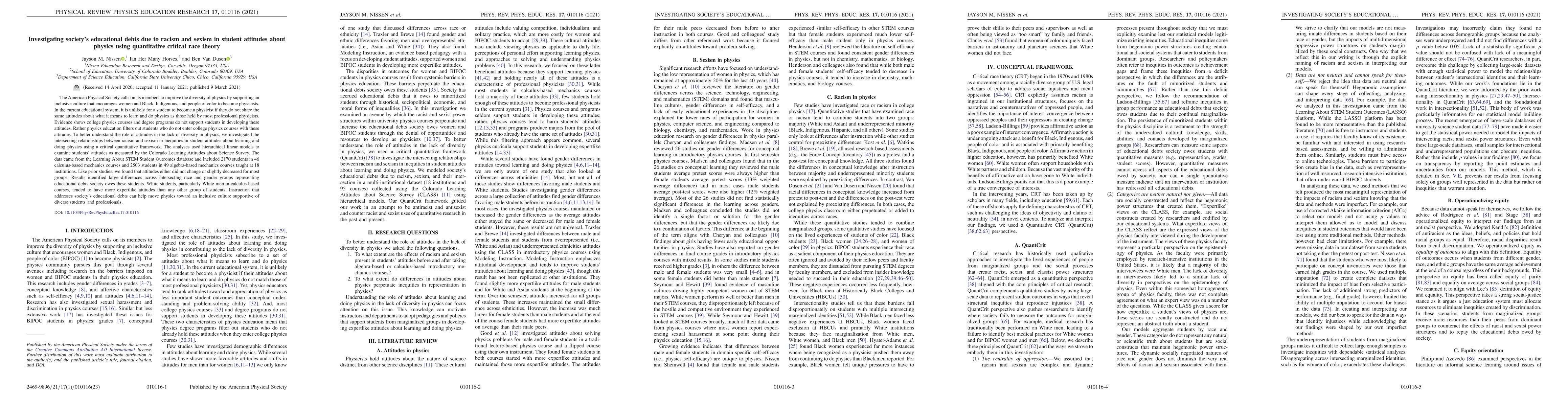 This study employs quantitative critical race theory to investigate how racism and sexism contribute to inequities in student attitudes about physics, revealing significant educational debts owed to students of color and women. Findings highlight that White men in calculus-based courses exhibit more expert-like attitudes, indicating a need for instruction that fosters an inclusive physics culture.
