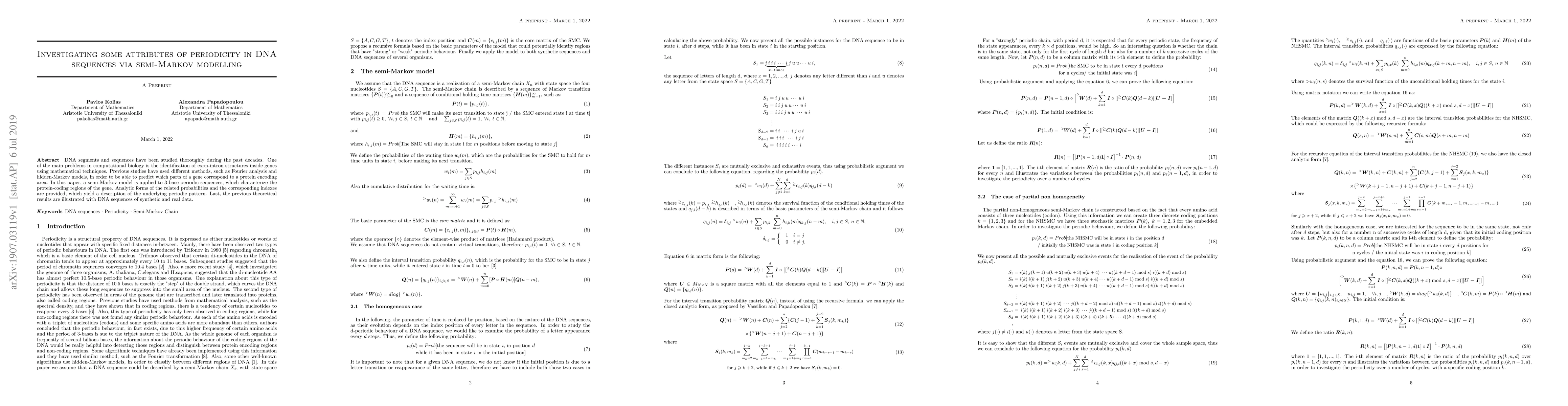 DNA segments and sequences have been studied thoroughly during the past decades. One of the main problems in computational biology is the identification of exon-intron structures inside genes using mathematical techniques. Previous studies have used different methods, such as Fourier analysis and hidden-Markov models, in order to be able to predict which parts of a gene correspond to a protein encoding area. In this paper, a semi-Markov model is applied to 3-base periodic sequences, which characterize the protein-coding regions of the gene. Analytic forms of the related probabilities and the corresponding indexes are provided, which yield a description of the underlying periodic pattern. Last, the previous theoretical results are illustrated with DNA sequences of synthetic and real data.