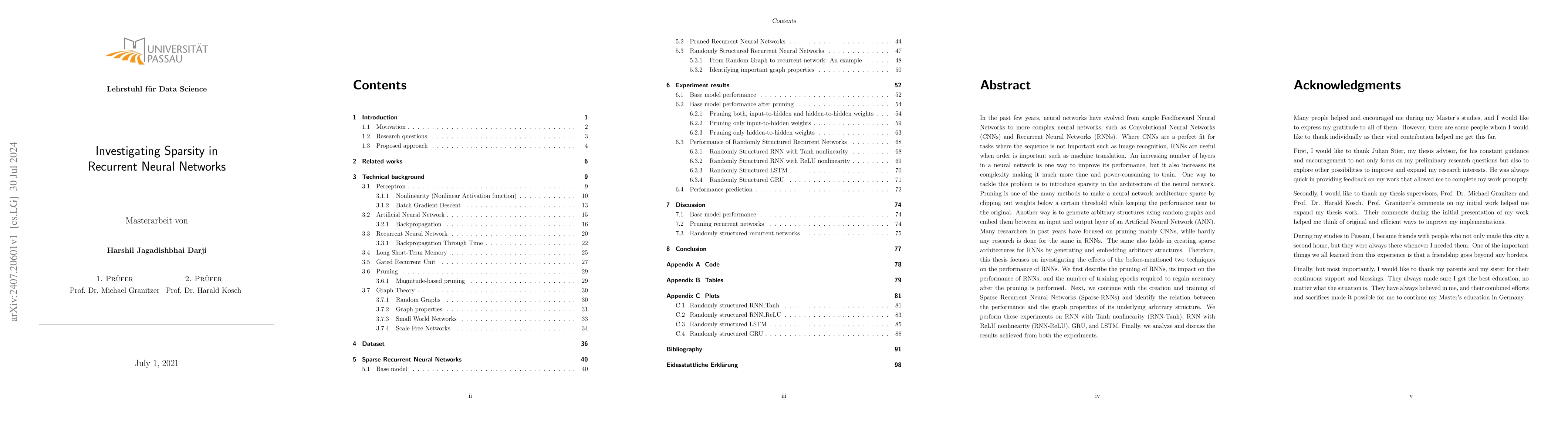 In the past few years, neural networks have evolved from simple Feedforward Neural Networks to more complex neural networks, such as Convolutional Neural Networks and Recurrent Neural Networks. Where CNNs are a perfect fit for tasks where the sequence is not important such as image recognition, RNNs are useful when order is important such as machine translation. An increasing number of layers in a neural network is one way to improve its performance, but it also increases its complexity making it much more time and power-consuming to train. One way to tackle this problem is to introduce sparsity in the architecture of the neural network. Pruning is one of the many methods to make a neural network architecture sparse by clipping out weights below a certain threshold while keeping the performance near to the original. Another way is to generate arbitrary structures using random graphs and embed them between an input and output layer of an Artificial Neural Network. Many researchers in past years have focused on pruning mainly CNNs, while hardly any research is done for the same in RNNs. The same also holds in creating sparse architectures for RNNs by generating and embedding arbitrary structures. Therefore, this thesis focuses on investigating the effects of the before-mentioned two techniques on the performance of RNNs. We first describe the pruning of RNNs, its impact on the performance of RNNs, and the number of training epochs required to regain accuracy after the pruning is performed. Next, we continue with the creation and training of Sparse Recurrent Neural Networks and identify the relation between the performance and the graph properties of its underlying arbitrary structure. We perform these experiments on RNN with Tanh nonlinearity (RNN-Tanh), RNN with ReLU nonlinearity (RNN-ReLU), GRU, and LSTM. Finally, we analyze and discuss the results achieved from both the experiments.