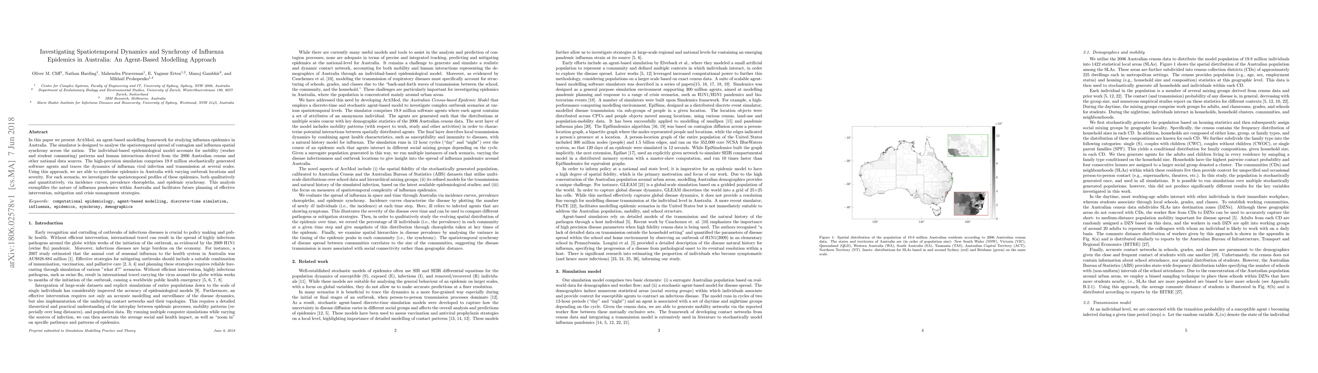 This paper introduces ACEMod, an agent-based model to study the spatiotemporal dynamics and synchrony of influenza epidemics in Australia, using detailed mobility and interaction data. The model simulates the spread of infection across 19.8 million agents, aiding in the analysis of epidemic profiles and informing strategies for intervention and crisis management.