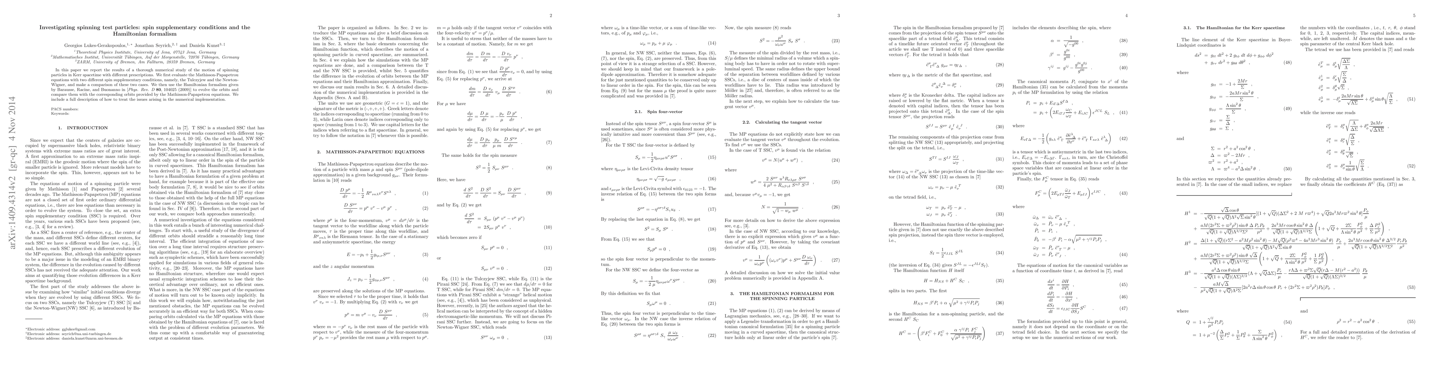 This paper investigates the motion of spinning particles in Kerr spacetime using the Mathisson-Papapetrou equations with Tulczyjew and Newton-Wigner spin supplementary conditions. It employs the Hamiltonian formalism by Barausse, Racine, and Buonanno to compare results and addresses numerical implementation challenges.