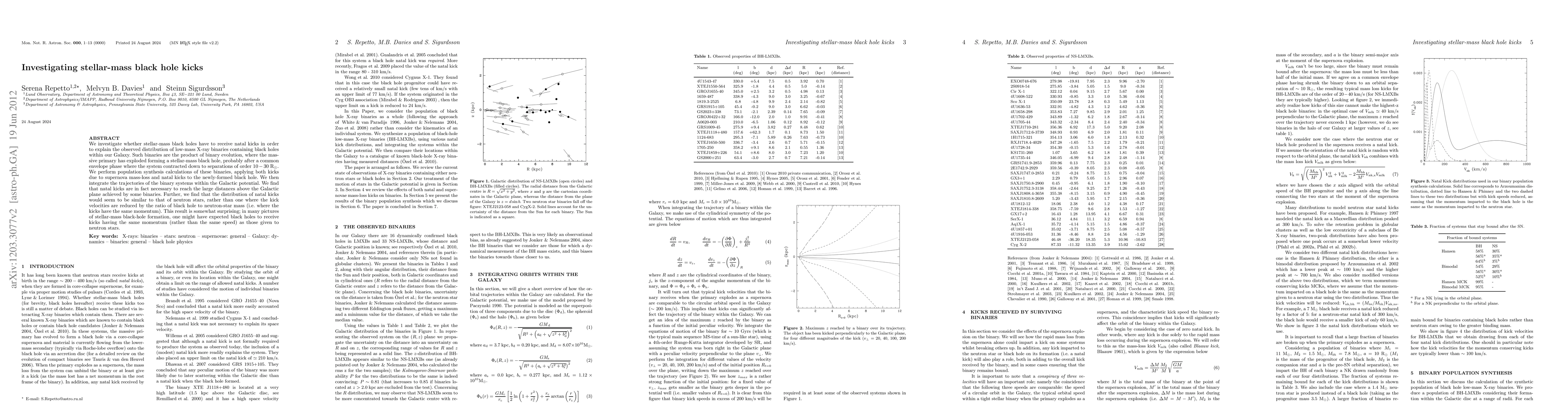 This paper investigates the necessity of natal kicks for stellar-mass black holes to explain the observed distribution of low-mass X-ray binaries in our Galaxy. The study finds that such kicks are essential for the binaries to reach large distances above the Galactic plane, and the distribution of these kicks appears similar to that of neutron stars.