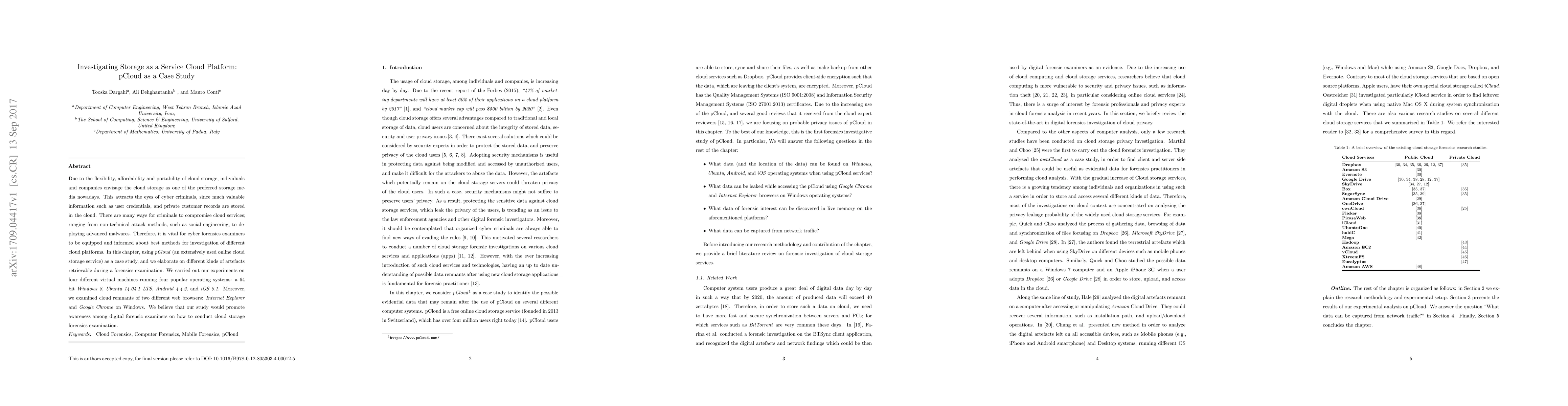 Due to the flexibility, affordability and portability of cloud storage, individuals and companies envisage the cloud storage as one of the preferred storage media nowadays. This attracts the eyes of cyber criminals, since much valuable informa- tion such as user credentials, and private customer records are stored in the cloud. There are many ways for criminals to compromise cloud services; ranging from non-technical attack methods, such as social engineering, to deploying advanced malwares. Therefore, it is vital for cyber forensics examiners to be equipped and informed about best methods for investigation of different cloud platforms. In this chapter, using pCloud (an extensively used online cloud storage service) as a case study, and we elaborate on different kinds of artefacts retrievable during a forensics examination. We carried out our experiments on four different virtual machines running four popular operating systems: a 64 bit Windows 8, Ubuntu 14.04.1 LTS, Android 4.4.2, and iOS 8.1. Moreover, we examined cloud remnants of two different web browsers: Internet Explorer and Google Chrome on Windows. We believe that our study would promote awareness among digital forensic examiners on how to conduct cloud storage forensics examination.
