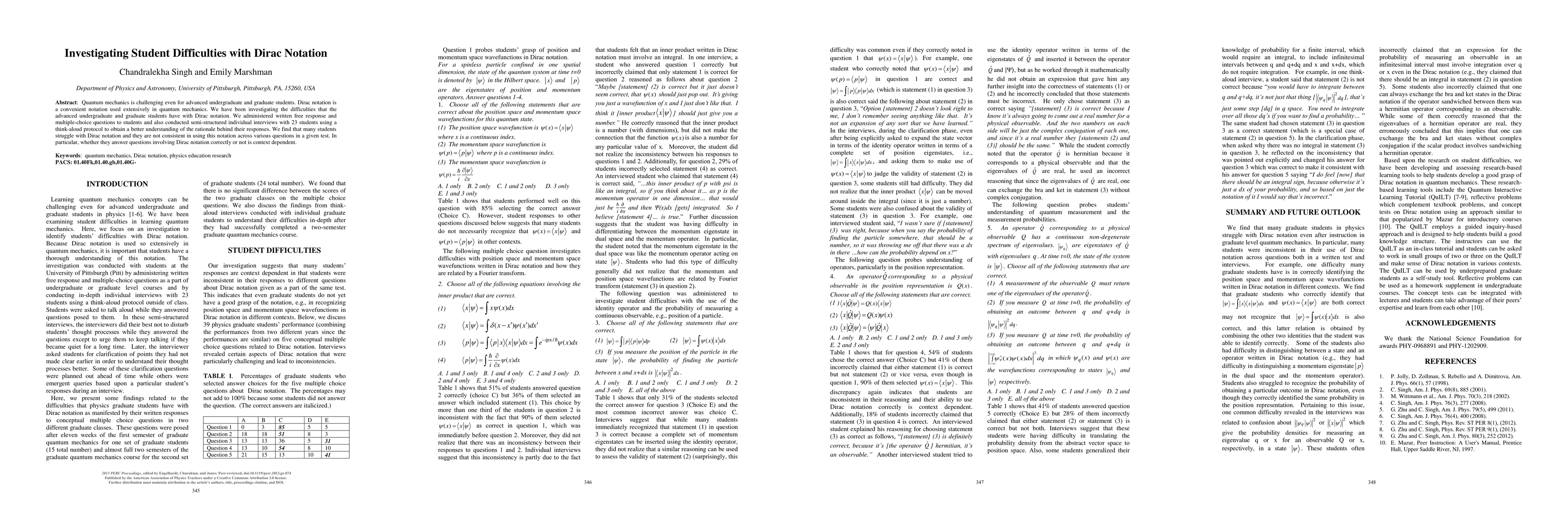This study investigates advanced undergraduate and graduate students' difficulties with Dirac notation in quantum mechanics, revealing inconsistent usage and context-dependent understanding through written tests and semi-structured interviews.