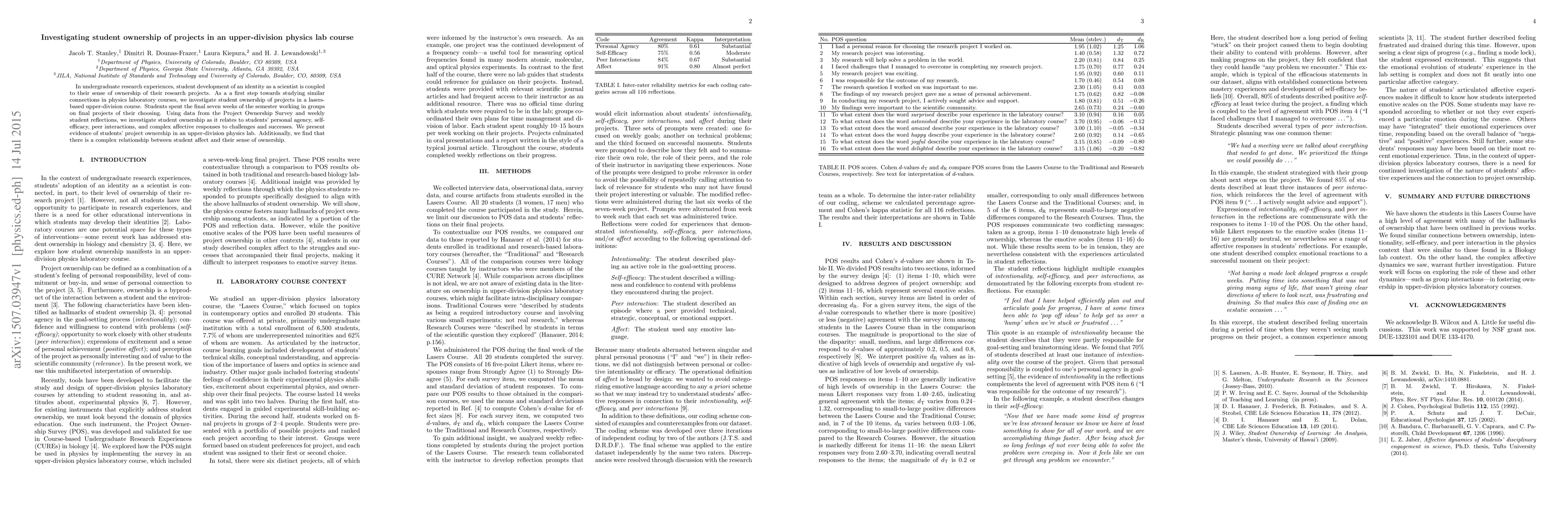This study explores student ownership in an upper-division physics lab course, examining how students' sense of ownership correlates with their personal agency, self-efficacy, and peer interactions. Findings reveal a complex relationship between student affect and their ownership, indicating that students' ownership is positively influenced by their engagement and experiences in the lab.