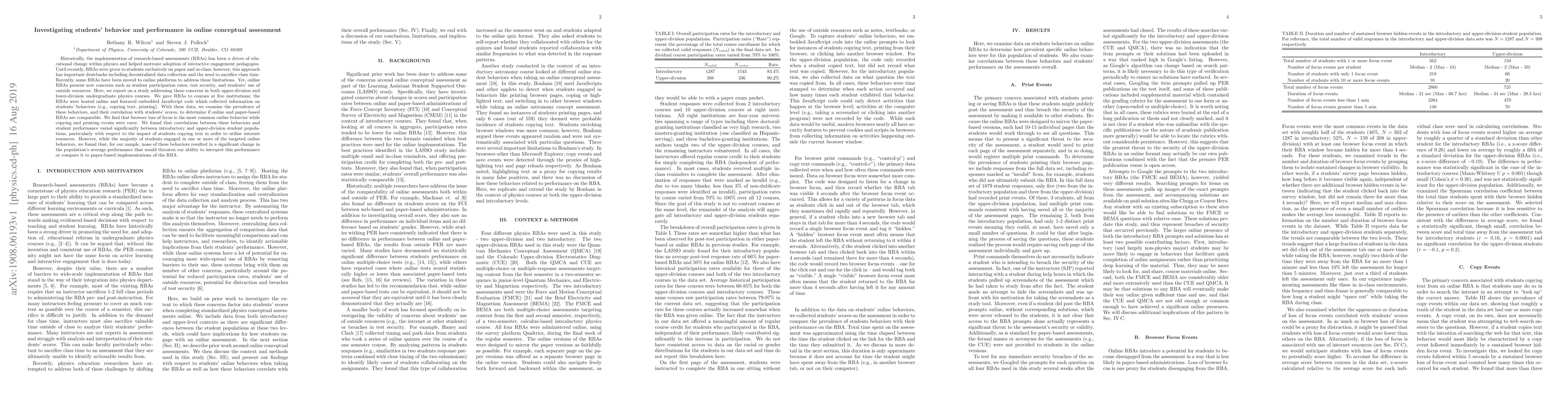 Historically, the implementation of research-based assessments (RBAs) has been a driver of educational change within physics and helped motivate adoption of interactive engagement pedagogies. Until recently, RBAs were given to students exclusively on paper and in-class; however, this approach has important drawbacks including decentralized data collection and the need to sacrifice class time. Recently, some RBAs have been moved to online platforms to address these limitations. Yet, online RBAs present new concerns such as student participation rates, test security, and students' use of outside resources. Here, we report on a study addressing these concerns in both upper-division and lower-division undergraduate physics courses. We gave RBAs to courses at five institutions; the RBAs were hosted online and featured embedded JavaScript code which collected information on students' behaviors (e.g., copying text, printing). With these data, we examine the prevalence of these behaviors, and their correlation with students' scores, to determine if online and paper-based RBAs are comparable. We find that browser loss of focus is the most common online behavior while copying and printing events were rarer. We found that correlations between these behaviors and student performance varied significantly between introductory and upper-division student populations, particularly with respect to the impact of students copying text in order to utilize internet resources. However, while the majority of students engaged in one or more of the targeted online behaviors, we found that, for our sample, none of these behaviors resulted in a significant change in the population's average performance that would threaten our ability to interpret this performance or compare it to paper-based implementations of the RBA.