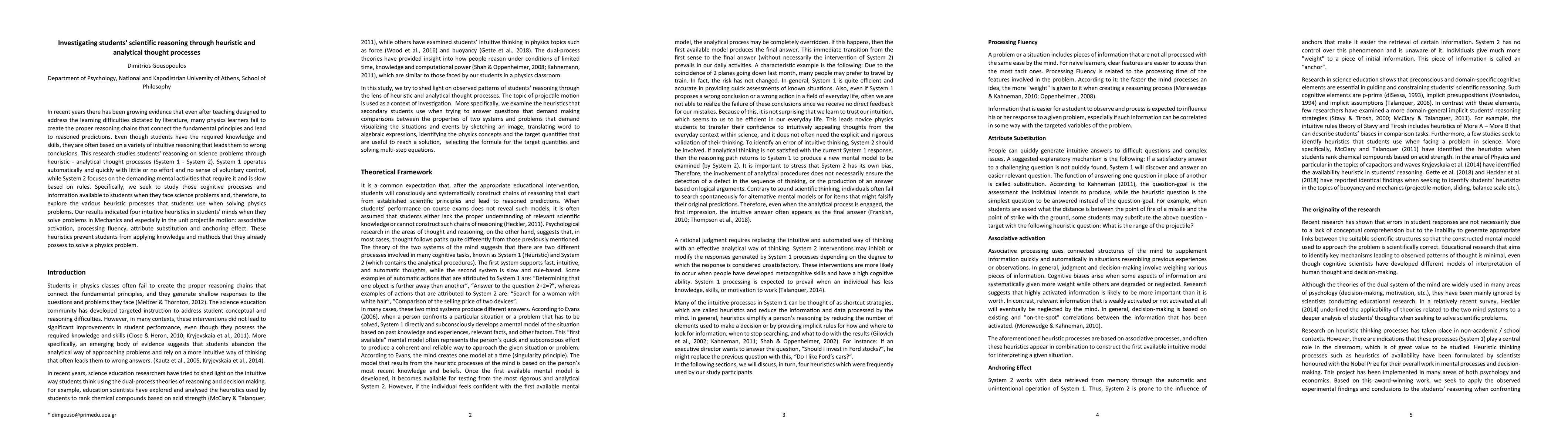 This research investigates how students' heuristic and analytical thought processes affect their scientific reasoning in physics, identifying four intuitive heuristics—associative activation, processing fluency, attribute substitution, and anchoring effect—that hinder proper application of learned principles despite possessing necessary knowledge.