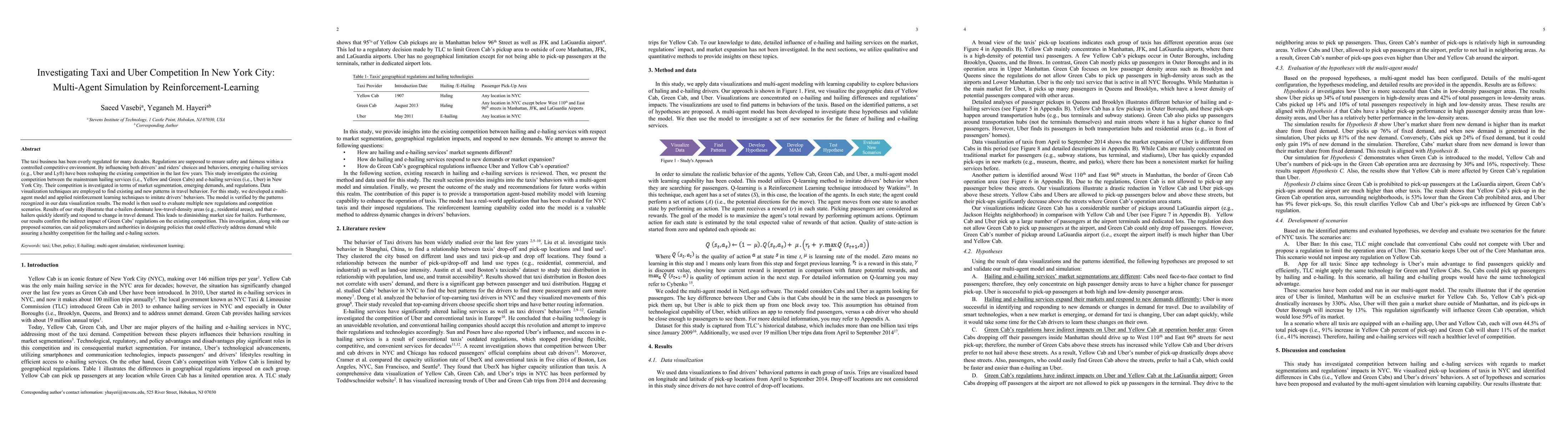 The taxi business has been overly regulated for many decades. Regulations are supposed to ensure safety and fairness within a controlled competitive environment. By influencing both drivers and riders choices and behaviors, emerging e-hailing services (e.g., Uber and Lyft) have been reshaping the existing competition in the last few years. This study investigates the existing competition between the mainstream hailing services (i.e., Yellow and Green Cabs) and e-hailing services (i.e., Uber) in New York City. Their competition is investigated in terms of market segmentation, emerging demands, and regulations. Data visualization techniques are employed to find existing and new patterns in travel behavior. For this study, we developed a multi-agent model and applied reinforcement learning techniques to imitate drivers behaviors. The model is verified by the patterns recognized in our data visualization results. The model is then used to evaluate multiple new regulations and competition scenarios. Results of our study illustrate that e-hailers dominate low-travel-density areas (e.g., residential areas), and that e-hailers quickly identify and respond to change in travel demand. This leads to diminishing market size for hailers. Furthermore, our results confirm the indirect impact of Green Cabs regulations on the existing competition. This investigation, along with our proposed scenarios, can aid policymakers and authorities in designing policies that could effectively address demand while assuring a healthy competition for the hailing and e-haling sectors. Keywords: taxi; Uber, policy; E-hailing; multi-agent simulation; reinforcement learning;