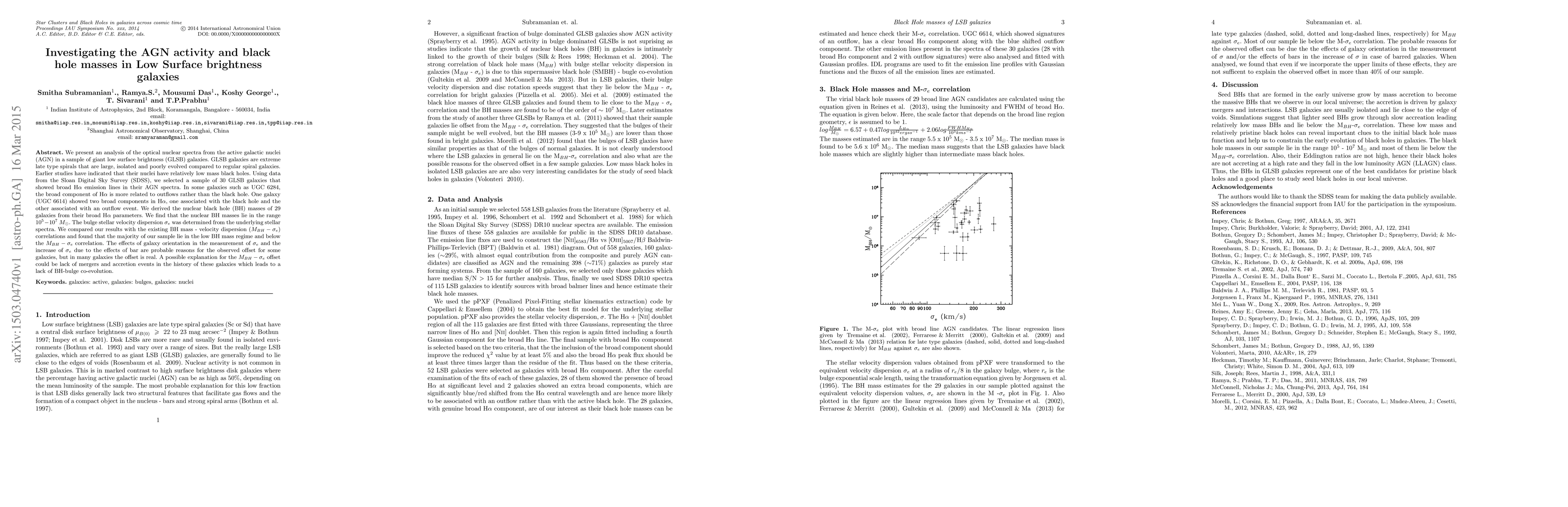 We present an analysis of the optical nuclear spectra from the active galactic nuclei (AGN) in a sample of giant low surface brightness (GLSB) galaxies. GLSB galaxies are extreme late type spirals that are large, isolated and poorly evolved compared to regular spiral galaxies. Earlier studies have indicated that their nuclei have relatively low mass black holes. Using data from the Sloan Digital Sky Survey (SDSS), we selected a sample of 30 GLSB galaxies that showed broad H$\alpha$ emission lines in their AGN spectra. In some galaxies such as UGC 6284, the broad component of H$\alpha$ is more related to outflows rather than the black hole. One galaxy (UGC 6614) showed two broad components in H$\alpha$, one associated with the black hole and the other associated with an outflow event. We derived the nuclear black hole (BH) masses of 29 galaxies from their broad H$\alpha$ parameters. We find that the nuclear BH masses lie in the range $10^{5}-10^{7} M_{\odot}$. The bulge stellar velocity dispersion $\sigma_{e}$ was determined from the underlying stellar spectra. We compared our results with the existing BH mass - velocity dispersion ($M_{BH}-\sigma_{e}$) correlations and found that the majority of our sample lie in the low BH mass regime and below the $M_{BH}-\sigma_{e}$ correlation. The effects of galaxy orientation in the measurement of $\sigma_e$ and the increase of $\sigma_e$ due to the effects of bar are probable reasons for the observed offset for some galaxies, but in many galaxies the offset is real. A possible explanation for the $M_{BH}-\sigma_{e}$ offset could be lack of mergers and accretion events in the history of these galaxies which leads to a lack of BH-bulge co-evolution. \keywords{galaxies: active, galaxies: bulges, galaxies: nuclei}