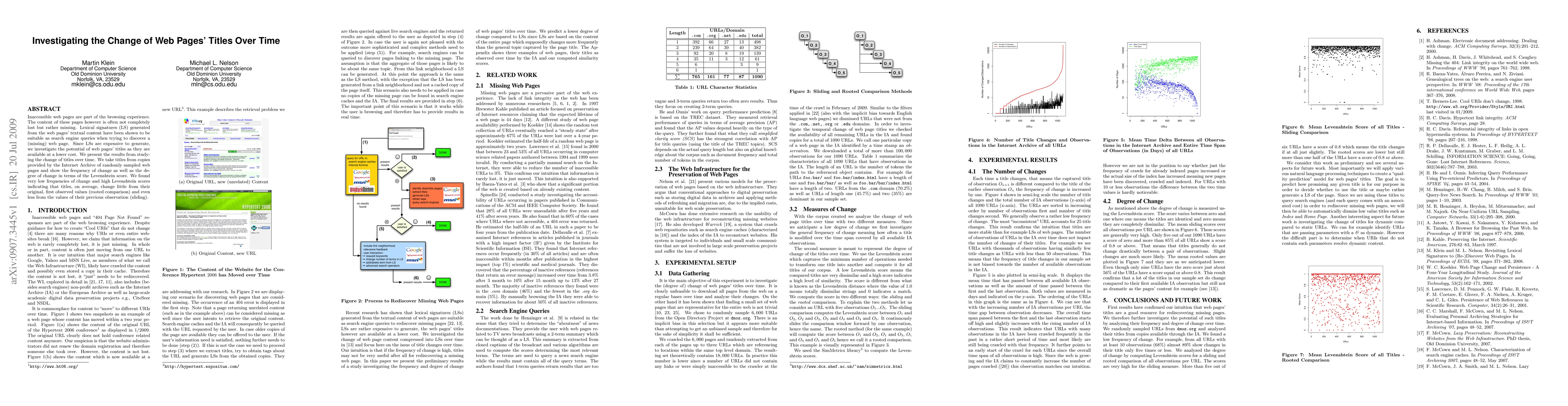Inaccessible web pages are part of the browsing experience. The content of these pages however is often not completely lost but rather missing. Lexical signatures (LS) generated from the web pages' textual content have been shown to be suitable as search engine queries when trying to discover a (missing) web page. Since LSs are expensive to generate, we investigate the potential of web pages' titles as they are available at a lower cost. We present the results from studying the change of titles over time. We take titles from copies provided by the Internet Archive of randomly sampled web pages and show the frequency of change as well as the degree of change in terms of the Levenshtein score. We found very low frequencies of change and high Levenshtein scores indicating that titles, on average, change little from their original, first observed values (rooted comparison) and even less from the values of their previous observation (sliding).
