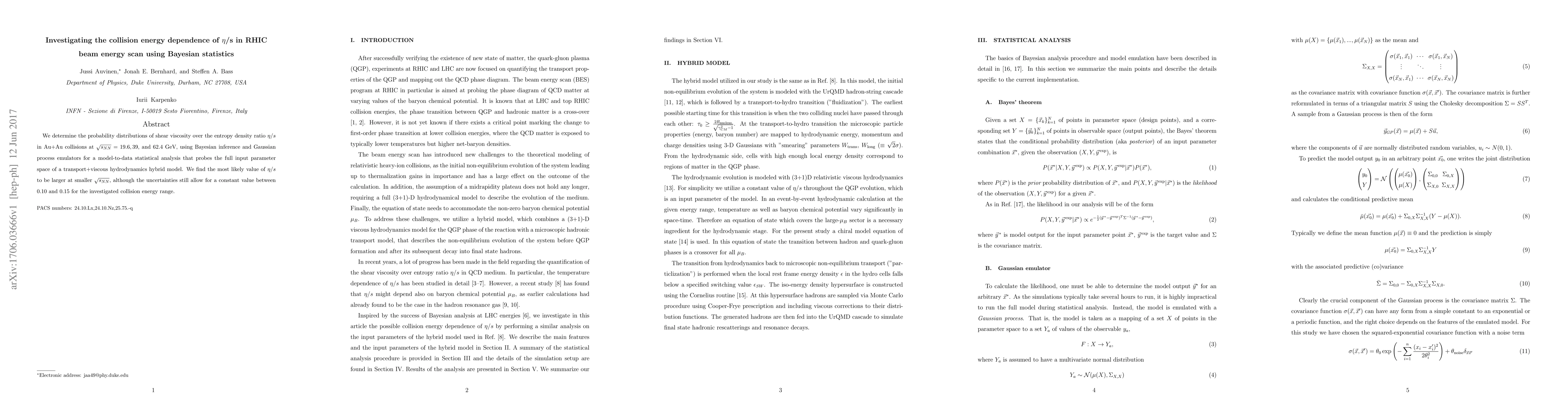We determine the probability distributions of shear viscosity over the entropy density ratio $\eta/s$ in Au+Au collisions at $\sqrt{s_{NN}}=19.6, 39$, and $62.4$ GeV, using Bayesian inference and Gaussian process emulators for a model-to-data statistical analysis that probes the full input parameter space of a transport+viscous hydrodynamics hybrid model. We find the most likely value of $\eta/s$ to be larger at smaller $\sqrt{s_{NN}}$, although the uncertainties still allow for a constant value between 0.10 and 0.15 for the investigated collision energy range.