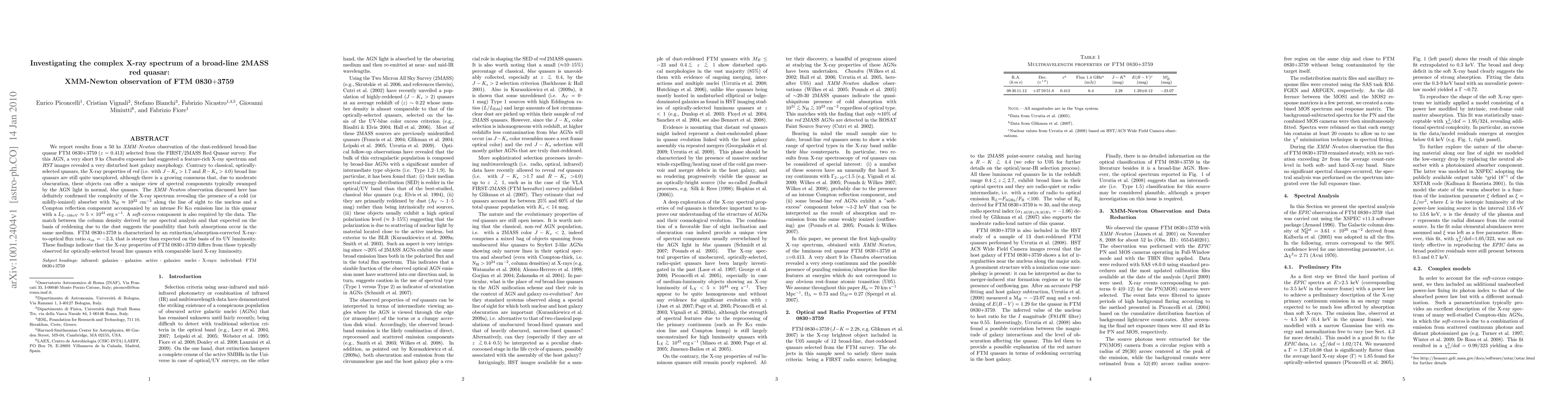 This study, using XMM-Newton observations of the red quasar FTM 0830+3759, confirms its complex X-ray spectrum with a cold absorber, Compton reflection, intense Fe K emission, and a soft-excess component. The absorption column density matches the reddening estimate, suggesting a single medium for both. The quasar's X-ray-to-optical flux ratio is steeper than expected, highlighting its distinct X-ray properties from typical broad-line quasars with similar hard X-ray luminosity.