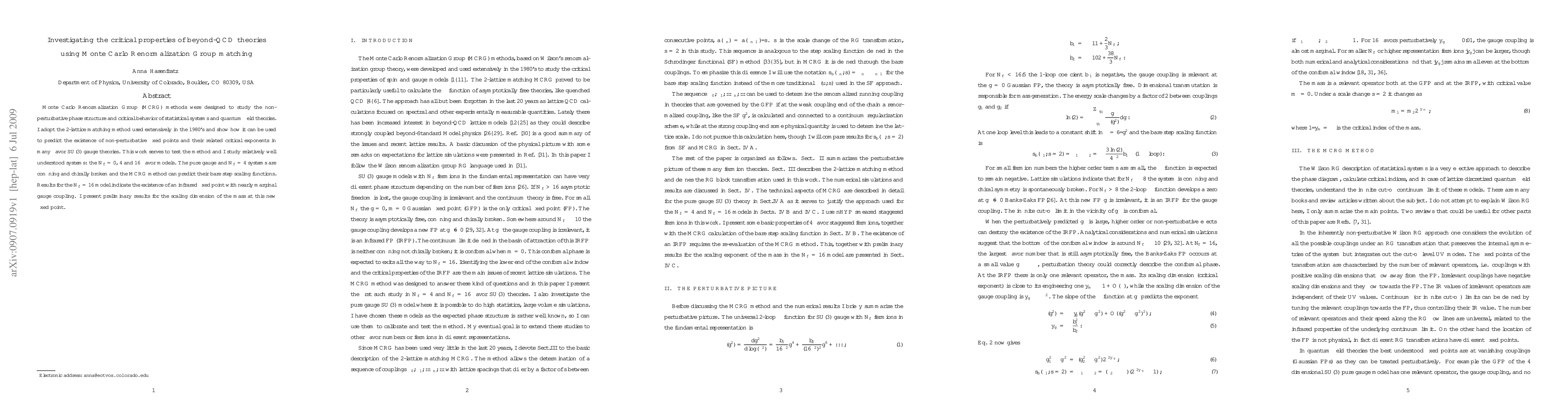 This paper employs Monte Carlo Renormalization Group (MCRG) methods to investigate the critical properties and non-perturbative phase structure of beyond-QCD theories, specifically focusing on the $N_f=0$, 4, and 16 flavor models. The study reveals the existence of an infrared fixed point in the $N_f=16$ model, indicating a nearly marginal gauge coupling and presenting preliminary results for the scaling dimension of the mass at this new fixed point.