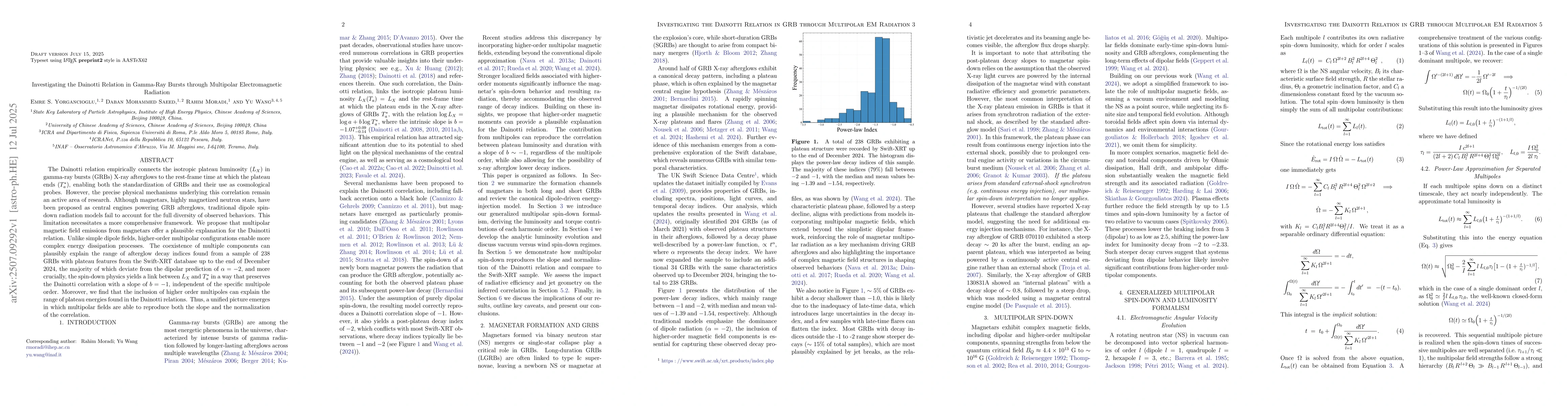 The Dainotti relation empirically connects the isotropic plateau luminosity ($L_X$) in gamma-ray bursts (GRBs) X-ray afterglows to the rest-frame time at which the plateau ends ($T_a^*$), enabling both the standardization of GRBs and their use as cosmological probes. However, the precise physical mechanisms underlying this correlation remain an active area of research. Although magnetars, highly magnetized neutron stars, have been proposed as central engines powering GRB afterglows, traditional dipole spin-down radiation models fail to account for the full diversity of observed behaviors. This limitation necessitates a more comprehensive framework. We propose that multipolar magnetic field emissions from magnetars offer a plausible explanation for the Dainotti relation. Unlike simple dipole fields, higher-order multipolar configurations enable more complex energy dissipation processes. The coexistence of multiple components can plausibly explain the range of afterglow decay indices found from a sample of 238 GRBs with plateau features from the Swift-XRT database up to the end of December 2024, the majority of which deviate from the dipolar prediction of $\alpha = -2$, and more crucially, the spin-down physics yields a link between $L_X$ and $T_a^*$ in a way that preserves the Dainotti correlation with a slope of $b = - 1$, independent of the specific multipole order. Moreover, we find that the inclusion of higher order multipoles can explain the range of plateau energies found in the Dainotti relations. Thus, a unified picture emerges in which multipolar fields are able to reproduce both the slope and the normalization of the correlation.