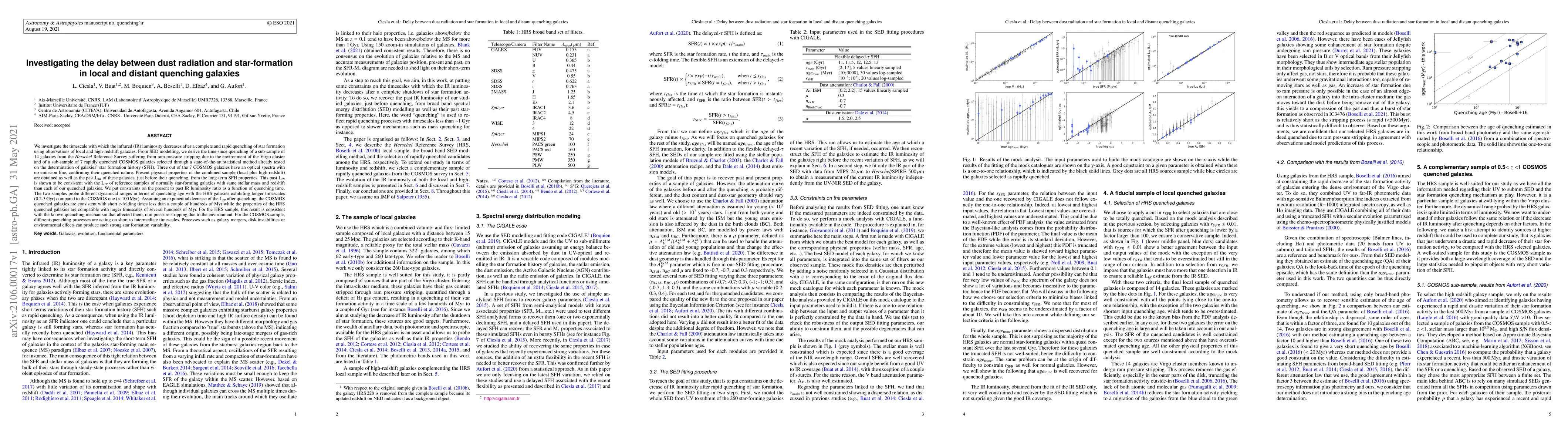 This paper investigates the delay between dust radiation decline and star-formation quenching in local and distant galaxies. It finds that while high-redshift COSMOS galaxies quench rapidly (<100 Myr), local Virgo cluster galaxies (HRS) exhibit longer quenching timescales (0.2-3 Gyr), suggesting different quenching mechanisms such as ram-pressure stripping and galaxy mergers.