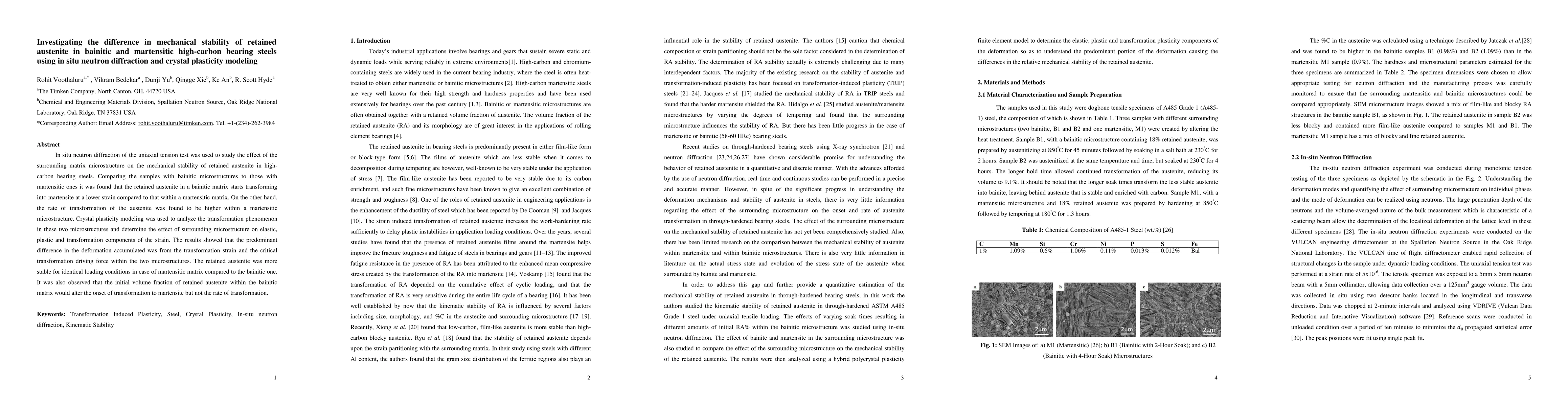 This study investigates the mechanical stability of retained austenite in bainitic versus martensitic high-carbon bearing steels using neutron diffraction and crystal plasticity modeling, revealing that retained austenite transforms at lower strains in bainitic matrices but transforms faster in martensitic ones.