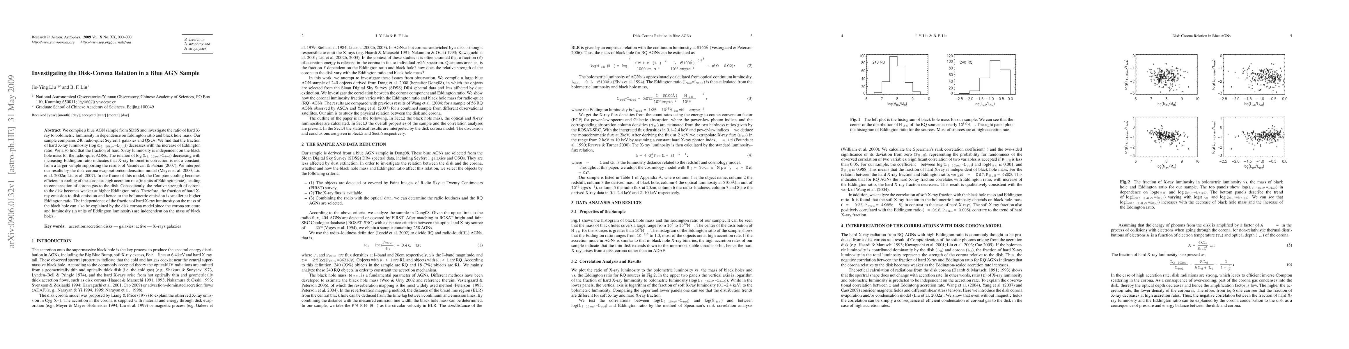 We compile a blue AGN sample from SDSS and investigate the ratio of hard X-ray to bolometric luminosity in dependence on Eddington ratio and black hole mass. Our sample comprises 240 radio-quiet Seyfert 1 galaxies and QSOs. We find that the fraction of hard X-ray luminosity (log$(L_{\rm 2-10 kev}/L_{\rm bol})$) decreases with the increase of Eddington ratio. We also find that the fraction of hard X-ray luminosity is independent on the black hole mass for the radio-quiet AGNs. The relation of log$(L_{\rm 2-10 kev}/L_{\rm bol})$ decreasing with increasing Eddington ratio indicates that X-ray bolometric correction is not a constant, from a larger sample supporting the results of Vasudevan & Fabian (2007). We interpret our results by the disk corona evaporation/condensation model (Meyer et al. \cite{me200}; Liu et al. 2002a; Liu et al. 2007). In the frame of this model, the Compton cooling becomes efficient in cooling of the corona at high accretion rate (in units of Eddington rate), leading to condensation of corona gas to the disk. Consequently, the relative strength of corona to the disk becomes weaker at higher Eddington ratio. Therefore, the fraction of hard X-ray emission to disk emission and hence to the bolometric emission is smaller at higher Eddington ratio. The independence of the fraction of hard X-ray luminosity on the mass of the black hole can also be explained by the disk corona model since the corona structure and luminosity (in units of Eddington luminosity) are independent on the mass of black holes.