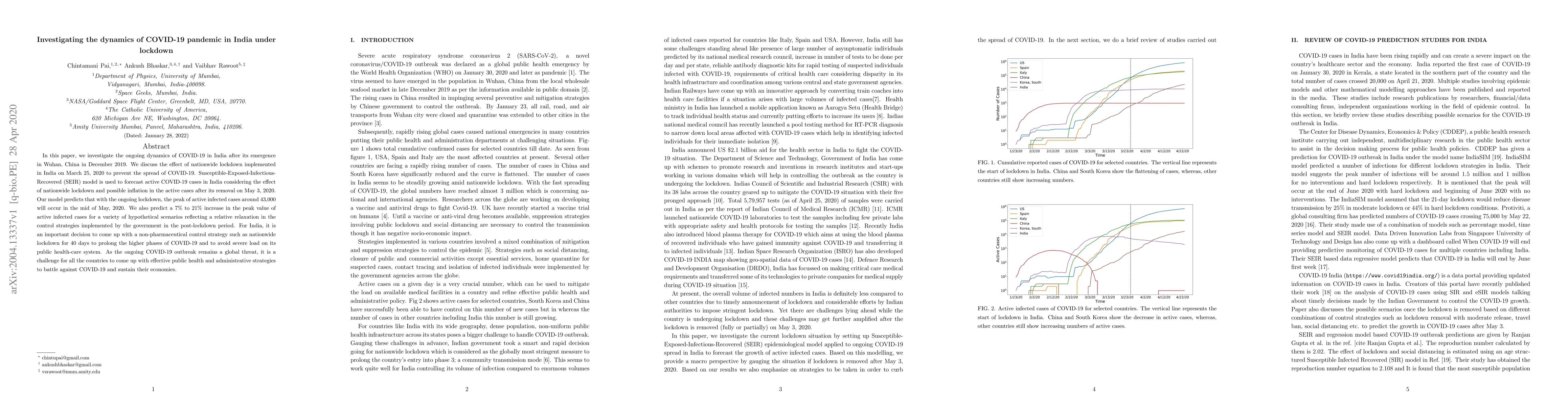 This paper uses an SEIR model to analyze the impact of India's nationwide lockdown on COVID-19 dynamics, predicting a peak of 43,000 active cases in mid-May 2020, and a potential 7%-21% increase if lockdown measures are relaxed. The study emphasizes the importance of prolonged lockdown strategies to manage healthcare system strain.
