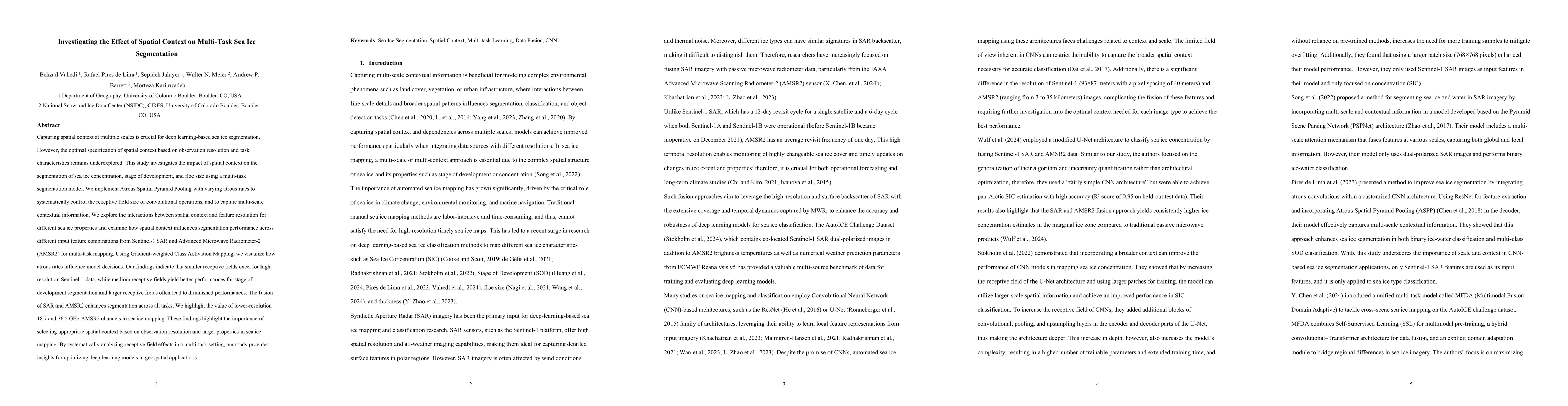 This study investigates the impact of spatial context on multi-task sea ice segmentation using a deep learning model with Atrous Spatial Pyramid Pooling (ASPP) to control receptive fields. The research explores the effect of varying atrous rates on segmentation performance for sea ice concentration, stage of development, and floe size, using Sentinel-1 SAR and AMSR2 data.