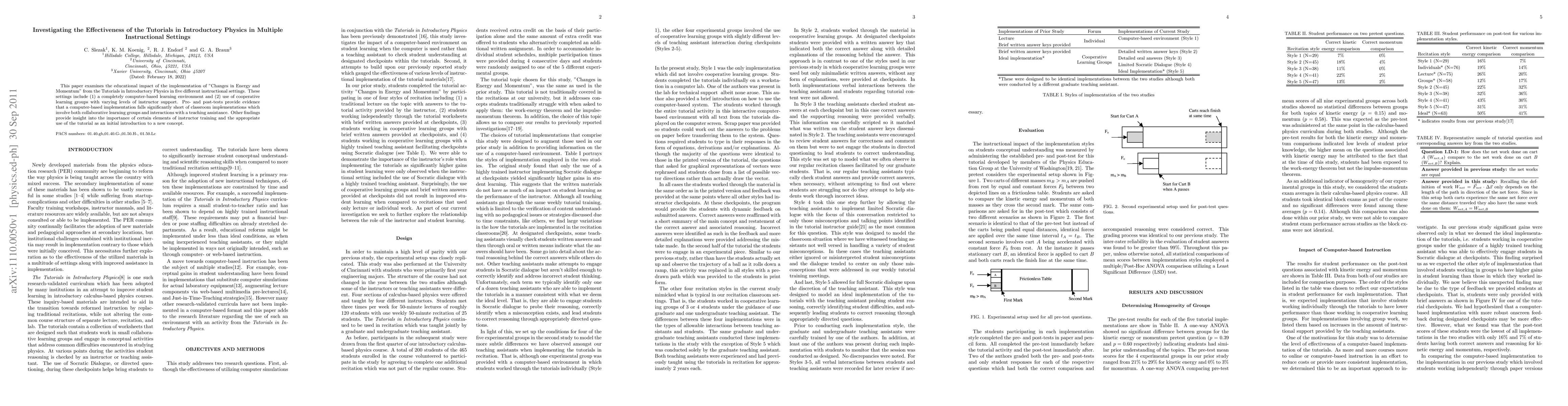 This paper examines the educational impact of the implementation of "Changes in Energy and Momentum" from the Tutorials in Introductory Physics in five different instructional settings. These settings include (1) a completely computer-based learning environment and (2) use of cooperative learning groups with varying levels of instructor support. Pre- and post-tests provide evidence that a computer-based implementation falls significantly short of classroom implementations which involve both collaborative learning groups and interactions with a teaching assistance. Other findings provide insight into the importance of certain elements of instructor training and the appropriate use of the tutorial as an initial introduction to a new concept.