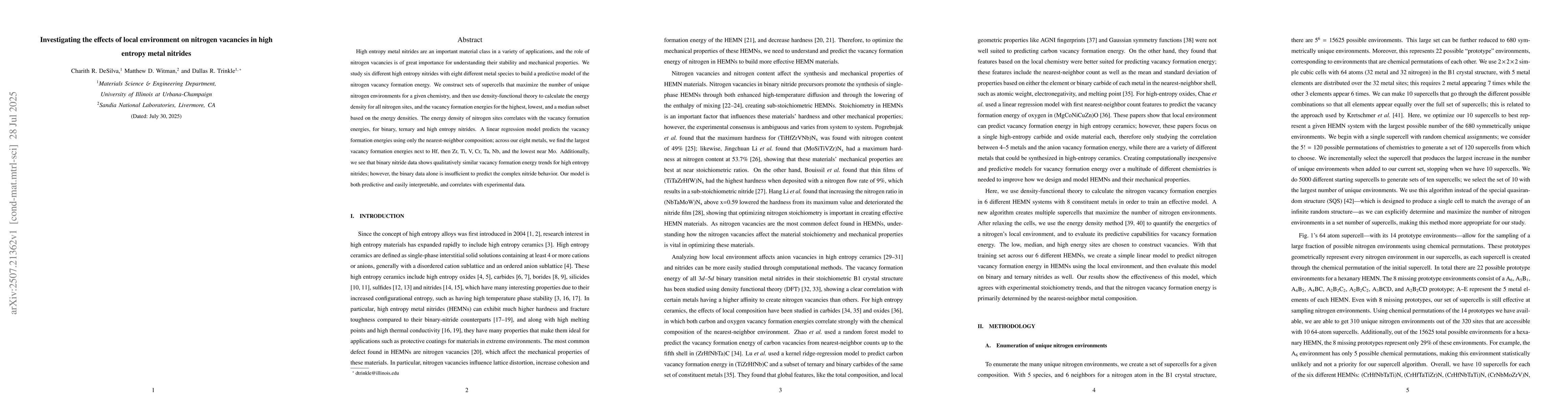 High entropy metal nitrides are an important material class in a variety of applications, and the role of nitrogen vacancies is of great importance for understanding their stability and mechanical properties. We study six different high entropy nitrides with eight different metal species to build a predictive model of the nitrogen vacancy formation energy. We construct sets of supercells that maximize the number of unique nitrogen environments for a given chemistry, and then use density-functional theory to calculate the energy density for all nitrogen sites, and the vacancy formation energies for the highest, lowest, and a median subset based on the energy densities. The energy density of nitrogen sites correlates with the vacancy formation energies, for binary, ternary and high entropy nitrides. A linear regression model predicts the vacancy formation energies using only the nearest-neighbor composition; across our eight metals, we find the largest vacancy formation energies next to Hf, then Zr, Ti, V, Cr, Ta, Nb, and the lowest near Mo. Additionally, we see that binary nitride data shows qualitatively similar vacancy formation energy trends for high entropy nitrides; however, the binary data alone is insufficient to predict the complex nitride behavior. Our model is both predictive and easily interpretable, and correlates with experimental data.