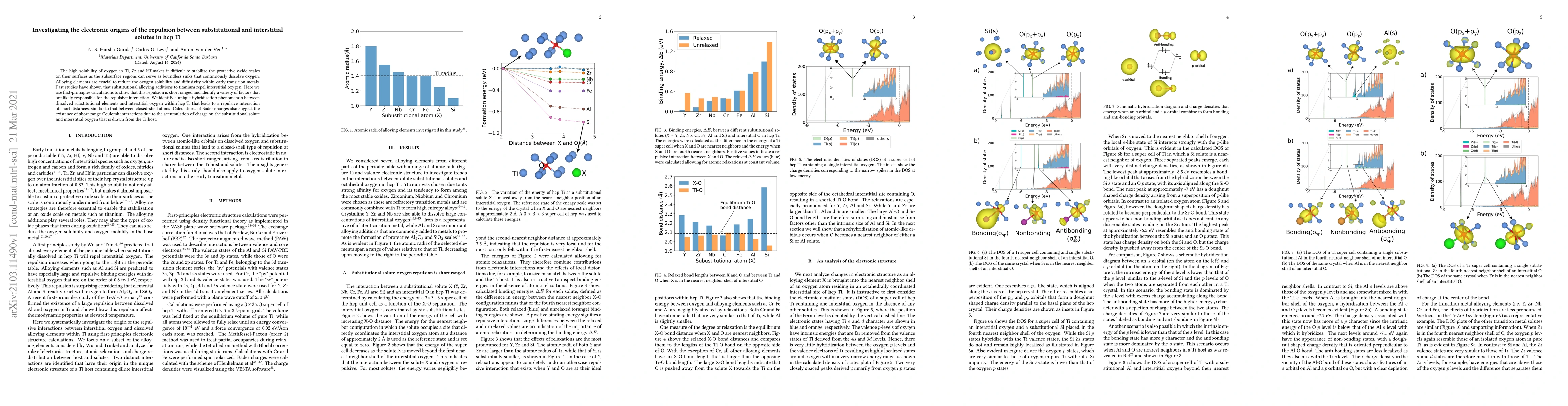 This study uses first-principles calculations to investigate the repulsion between substitutional and interstitial solutes in hcp Ti, identifying a hybridization phenomenon and Coulomb interactions as the primary causes of the short-range repulsion between these solutes. The findings suggest that alloying elements can reduce oxygen solubility and diffusivity.