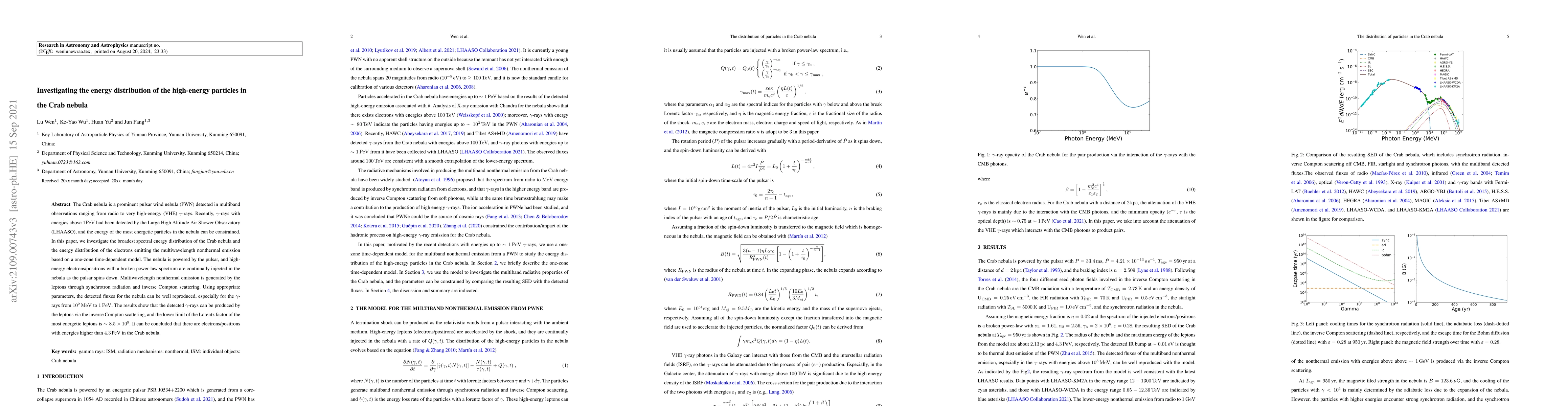 This paper investigates the spectral energy distribution of the Crab nebula, focusing on the energy distribution of high-energy particles based on a one-zone time-dependent model. The study finds that the detected $\gamma$-rays up to $1\,\mathrm{PeV}$ can be produced by inverse Compton scattering of high-energy electrons/positrons, with the most energetic particles having a Lorentz factor of $\sim 8.5\times10^{9}$.