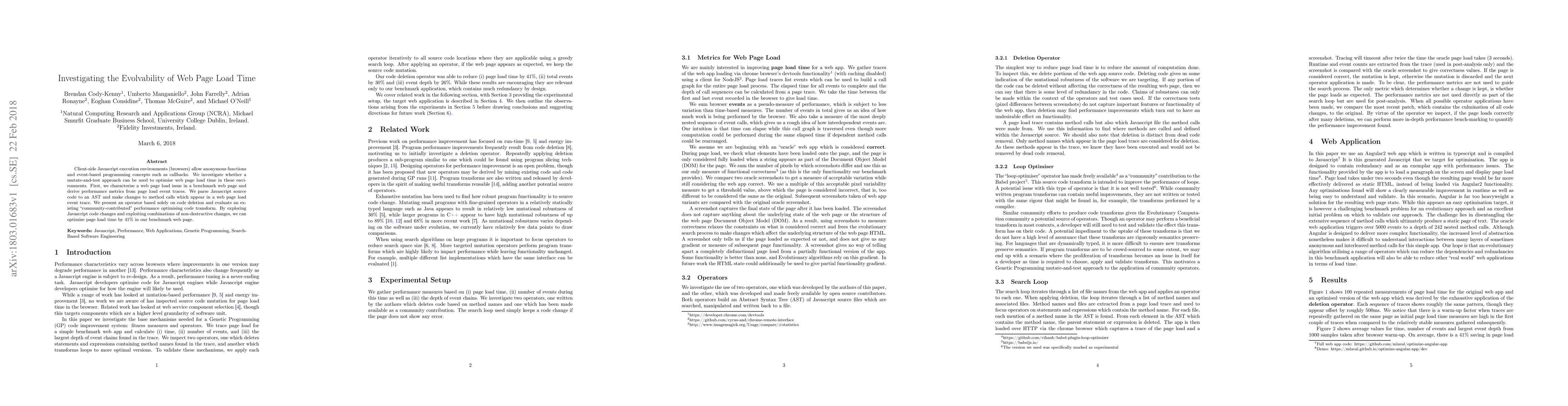 This study explores using a mutate-and-test approach to optimize web page load times through code deletions and transformations. The research demonstrates a 41% improvement in load time for a benchmark web page by analyzing and modifying JavaScript source code.