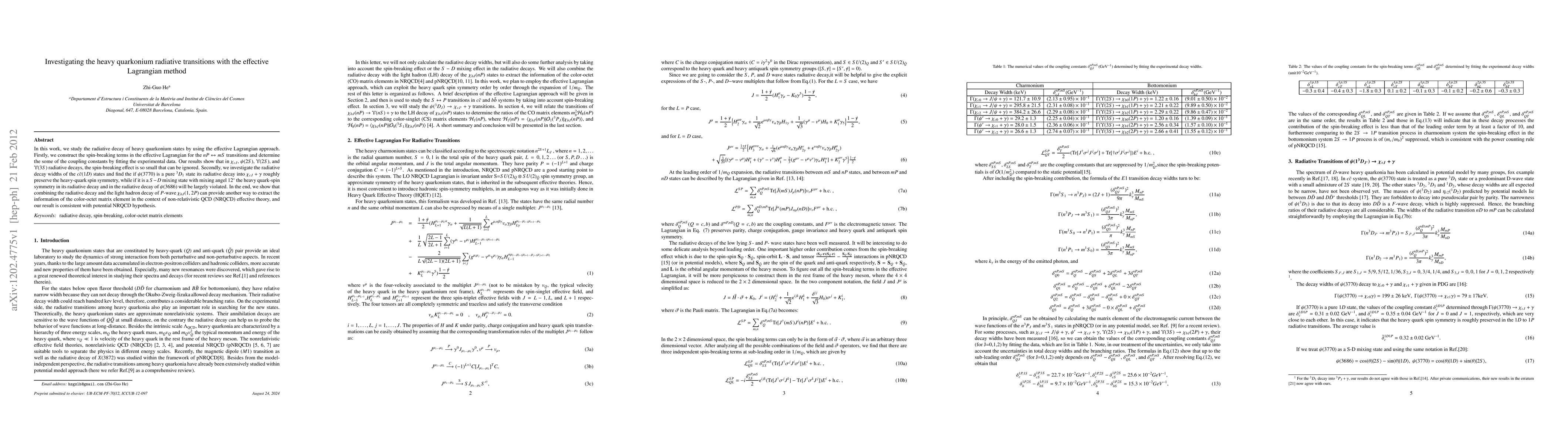 This paper investigates the radiative decay of heavy quarkonium states using the effective Lagrangian method, finding negligible spin-breaking effects in $\chi_{cJ}$, $\psi(2S)$, $\Upsilon(2S)$, and $\Upsilon(3S)$. It also explores the radiative decay of $c\bar{c}(1D)$ states, revealing that the spin symmetry is preserved if $\psi(3770)$ is a pure $^3D_1$ state, but violated if it is a $S-D$ mixing state.