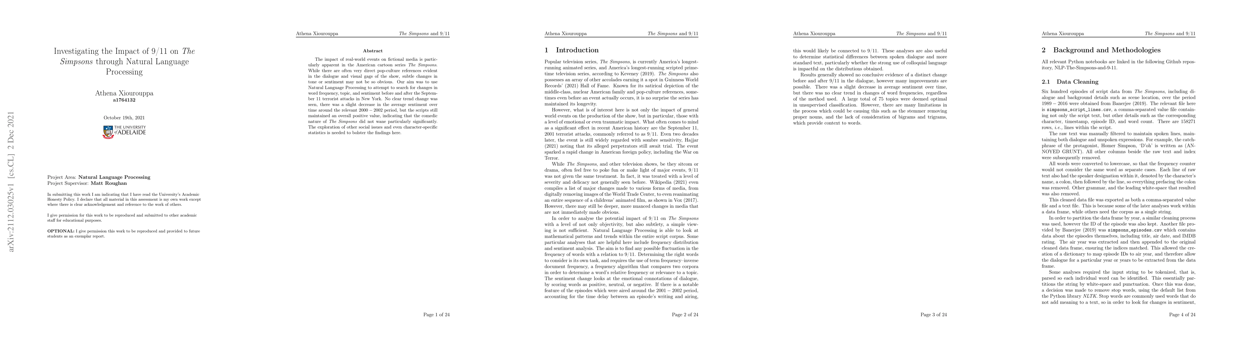 This study uses Natural Language Processing to analyze changes in The Simpsons' scripts before and after the 9/11 attacks, finding a slight decrease in average sentiment but no clear trend, maintaining the show's overall positive tone. Further exploration of social issues and character statistics is recommended to strengthen these findings.