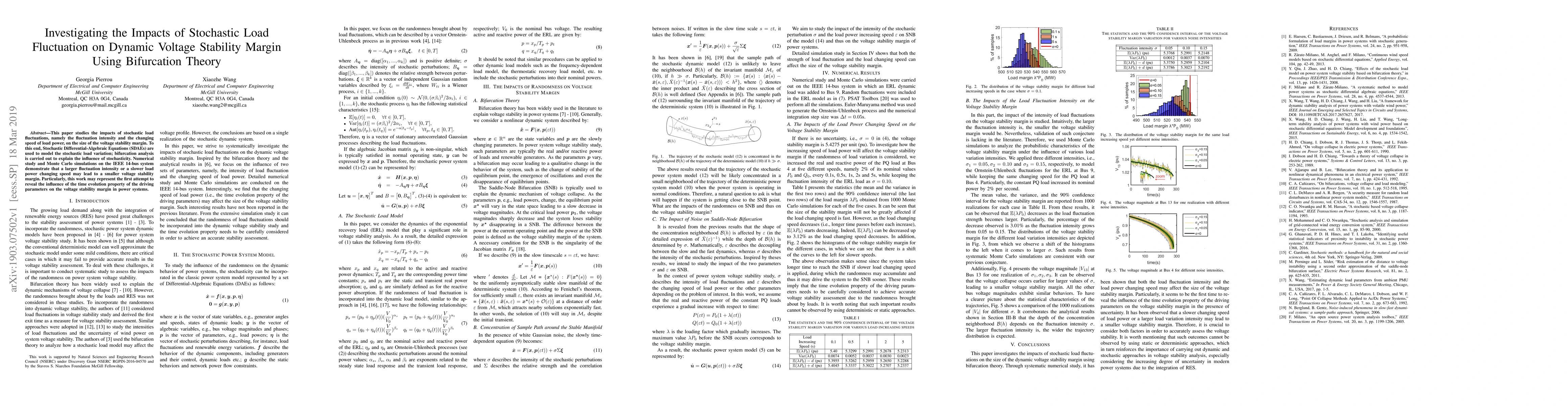 This paper studies the impacts of stochastic load fluctuations, namely the fluctuation intensity and the changing speed of load power, on the size of the voltage stability margin. To this end, Stochastic Differential-Algebraic Equations (SDAEs) are used to model the stochastic load variation; bifurcation analysis is carried out to explain the influence of stochasticity. Numerical study and Monte Carlo simulations on the IEEE 14-bus system demonstrate that a larger fluctuation intensity or a slower load power changing speed may lead to a smaller voltage stability margin. Particularly, this work may represent the first attempt to reveal the influence of the time evolution property of the driving parameters on the voltage stability margin in power systems.