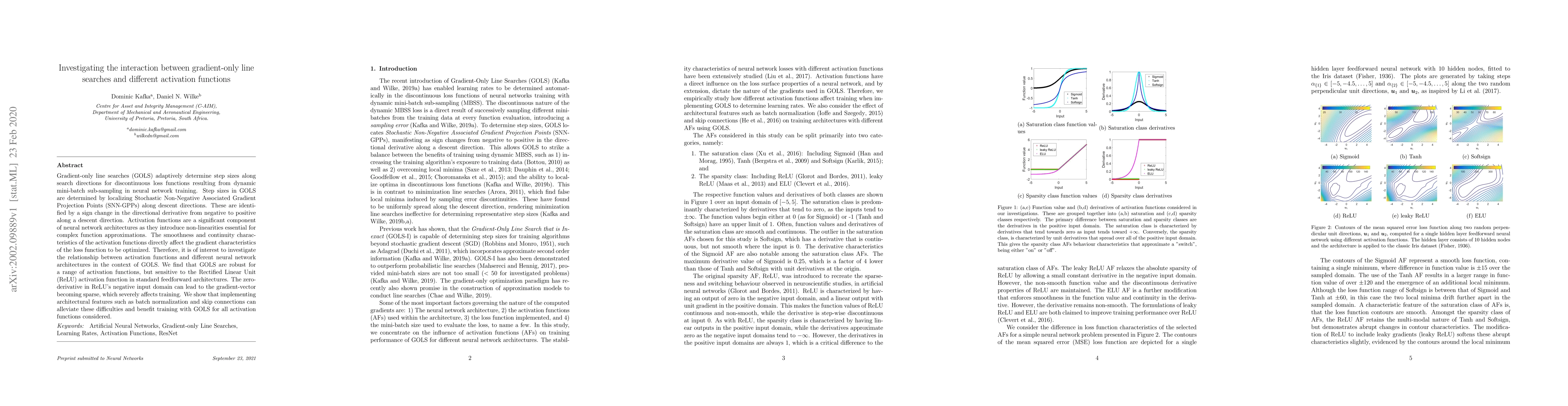 This research investigates the impact of various activation functions on gradient-only line searches (GOLS) in neural network training. It finds that while GOLS work well with many activation functions, they struggle with ReLU due to its sparse gradients in negative input domains. However, incorporating architectural features like batch normalization and skip connections can mitigate these issues, improving GOLS performance across all activation functions.