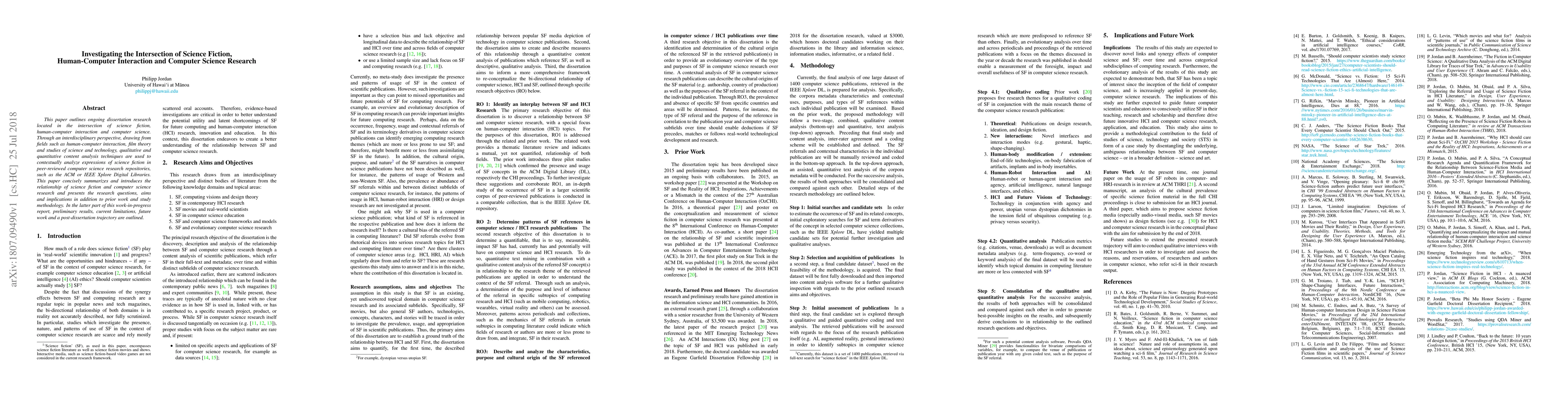 This paper outlines ongoing dissertation research located in the intersection of science fiction, human-computer interaction and computer science. Through an interdisciplinary perspective, drawing from fields such as human-computer interaction, film theory and studies of science and technology, qualitative and quantitative content analysis techniques are used to contextually analyze expressions of science fiction in peer-reviewed computer science research repositories, such as the ACM or IEEE Xplore Digital Libraries. This paper concisely summarizes and introduces the relationship of science fiction and computer science research and presents the research questions, aims and implications in addition to prior work and study methodology. In the latter part of this work-in-progress report, preliminary results, current limitations, future work and a post-dissertation trajectory are outlined.