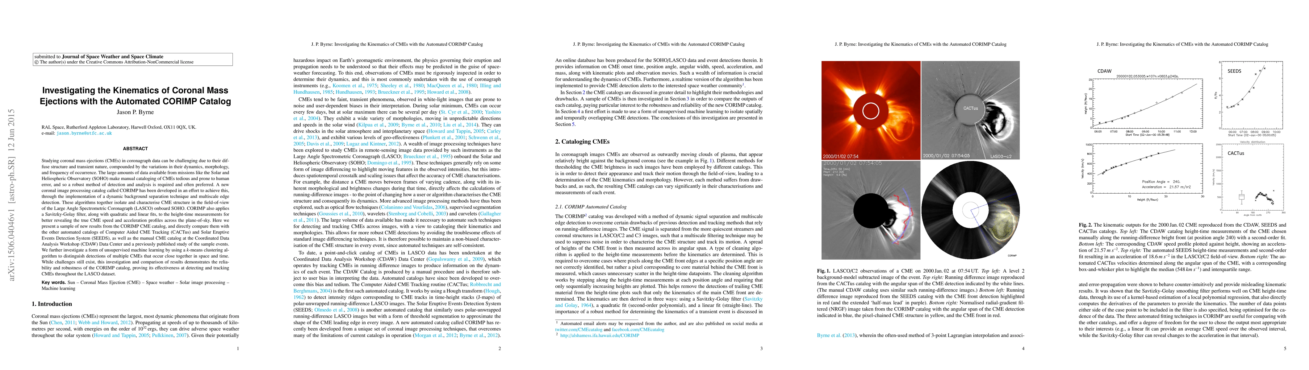 The Automated CORIMP Catalog improves coronal mass ejection (CME) detection and analysis using advanced algorithms for background separation, edge detection, and speed/acceleration profiling. Comparisons with other catalogs show its reliability and effectiveness in handling SOHO/LASCO data, while a k-means clustering algorithm distinguishes closely-occurring CMEs.