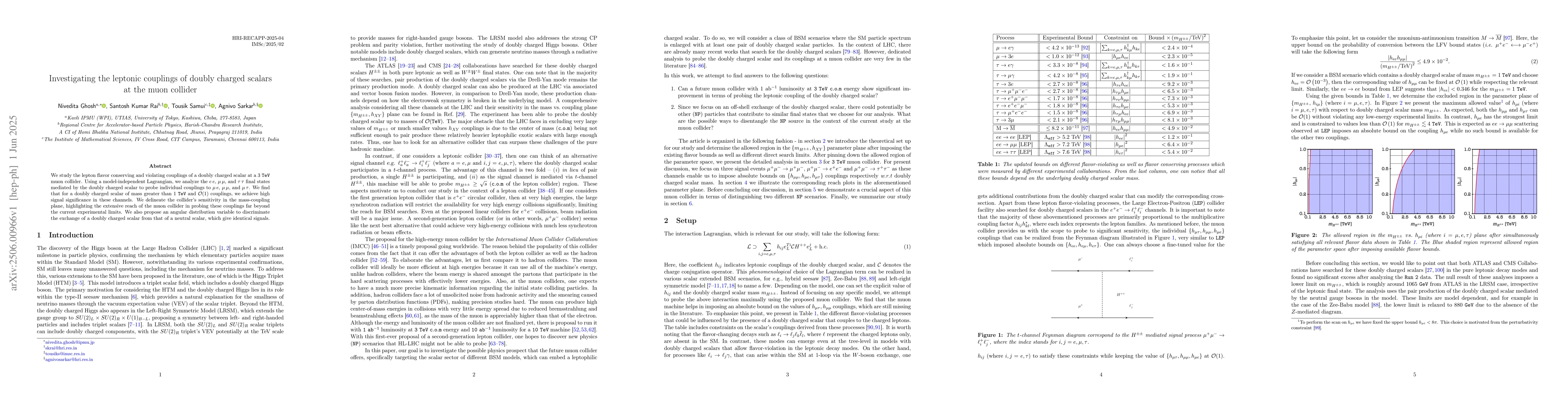 We study the lepton flavour conserving and violating couplings of a doubly charged scalar at a 3 TeV muon collider. Using a model independent Lagrangian, we analyse the electron electron, muon muon, and tau tau final states mediated by the doubly charged scalar to probe individual couplings to mu e, mu mu, and mu tau. We find that for a doubly charged scalar of mass greater than 1 TeV and order one couplings, we achieve high signal significance in these channels. We delineate the collider s sensitivity in the mass vs coupling plane, highlighting the extensive reach of the muon collider in probing these couplings far beyond the current experimental limits. We also propose an angular distribution variable to discriminate the exchange of a doubly charged scalar from that of a neutral scalar, which give identical signals.