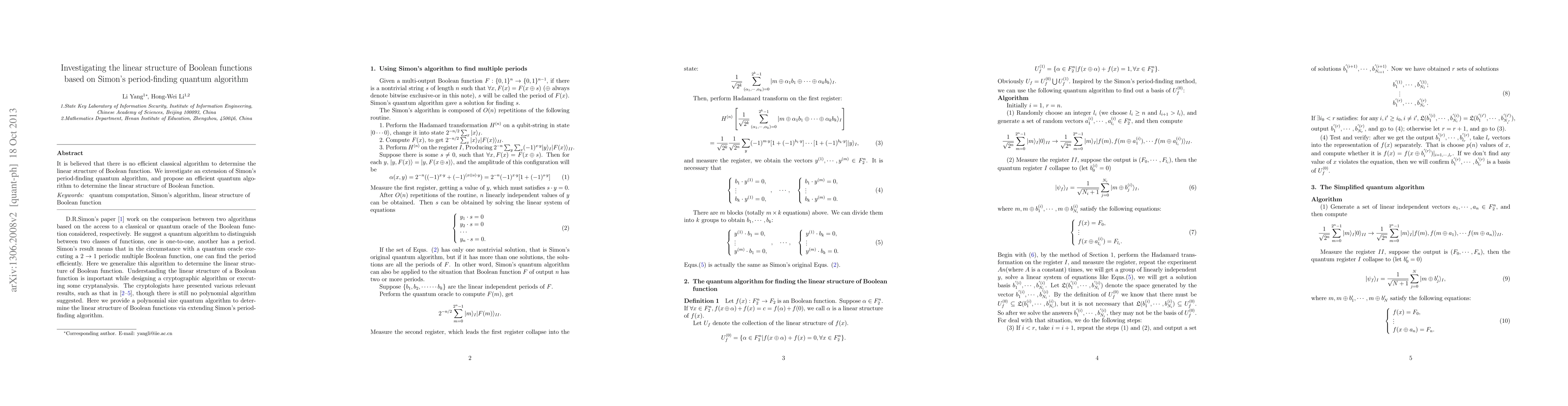 This paper proposes a quantum algorithm based on Simon's period-finding method to efficiently determine the linear structure of Boolean functions, addressing the lack of efficient classical algorithms for this task. The proposed quantum approach aims to enhance computational efficiency in identifying such structures.