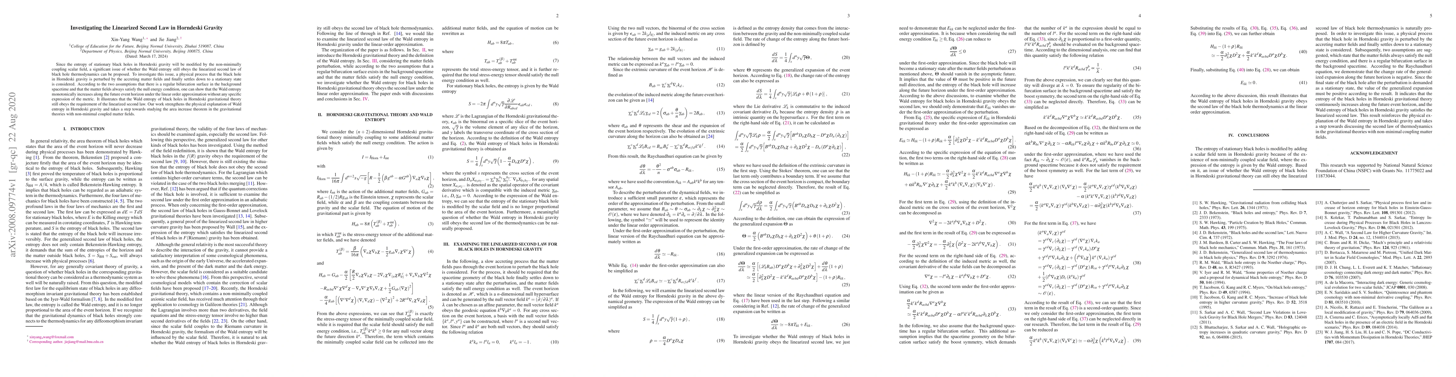 This paper investigates whether the Wald entropy in Horndeski gravity obeys the linearized second law of black hole thermodynamics, showing that it monotonically increases under perturbation and linear approximation, thus supporting the area increase theorem in theories with non-minimally coupled scalar fields.