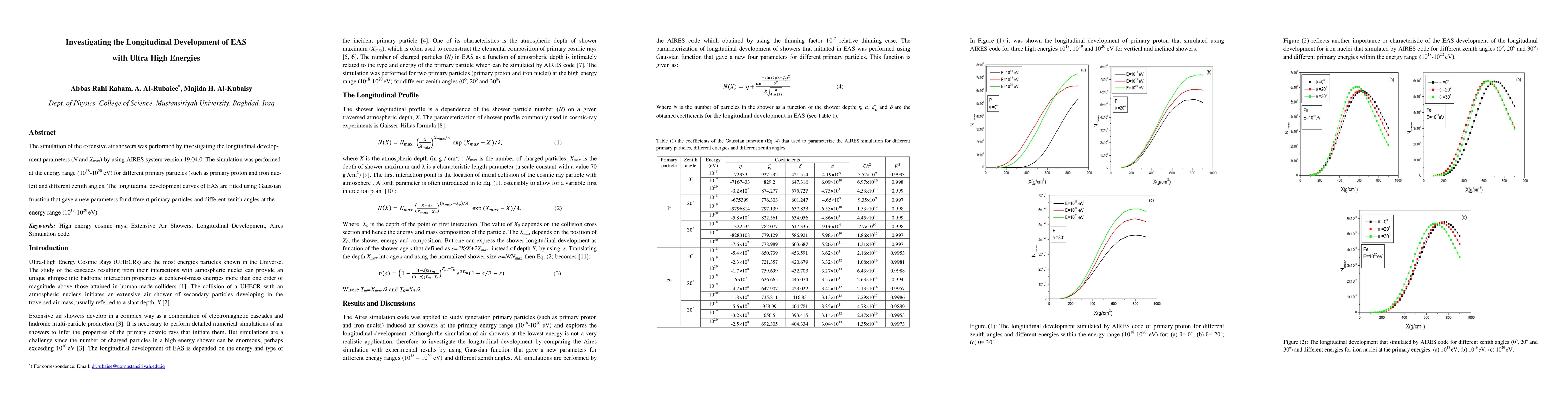 The simulation of the extensive air showers was performed by investigating the longitudinal development parameters (N and Xmax) by using AIRES system version 19.04.0. The simulation was performed at the energy range (10^18-10^20 eV) for different primary particles (such as primary proton and iron nuclei) and different zenith angles. The longitudinal development curves of EAS are fitted using Gaussian function that gave a new parameters for different primary particles and different zenith angles at the energy range (10^18-10^20 eV).