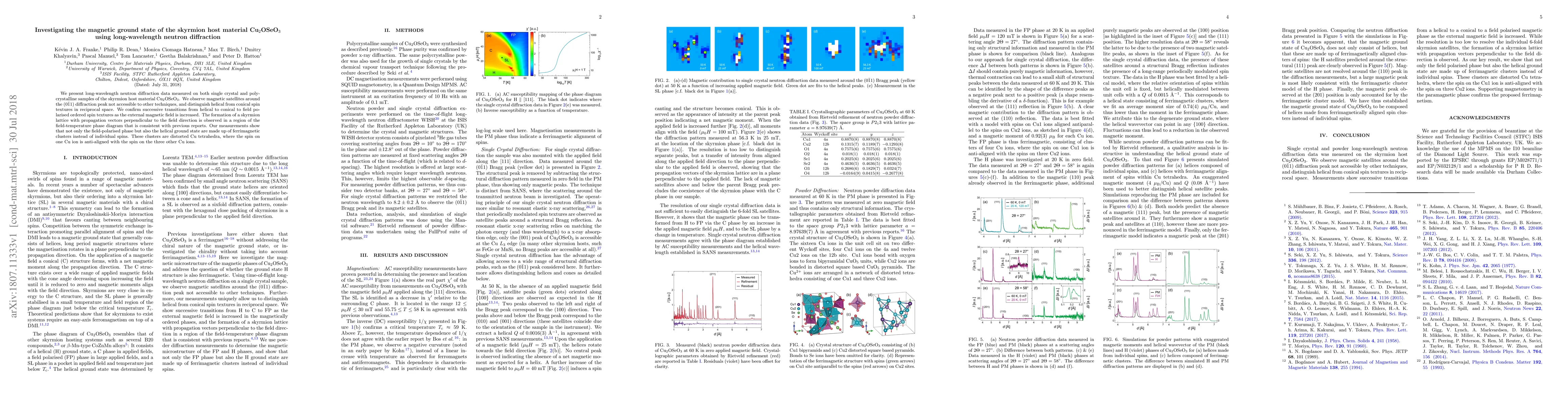 We present long-wavelength neutron diffraction data measured on both single crystal and polycrystalline samples of the skyrmion host material Cu$_{2}$OSeO$_{3}$. We observe magnetic satellites around the $(0\bar{1}1)$ diffraction peak not accessible to other techniques, and distinguish helical from conical spin textures in reciprocal space. We confirm successive transitions from helical to conical to field polarised ordered spin textures as the external magnetic field is increased. The formation of a skyrmion lattice with propagation vectors perpendicular to the field direction is observed in a region of the field-temperature phase diagram that is consistent with previous reports. Our measurements show that not only the field-polarised phase but also the helical ground state are made up of ferrimagnetic clusters instead of individual spins. These clusters are distorted Cu tetrahedra, where the spin on one Cu ion is anti-aligned with the spin on the three other Cu ions.