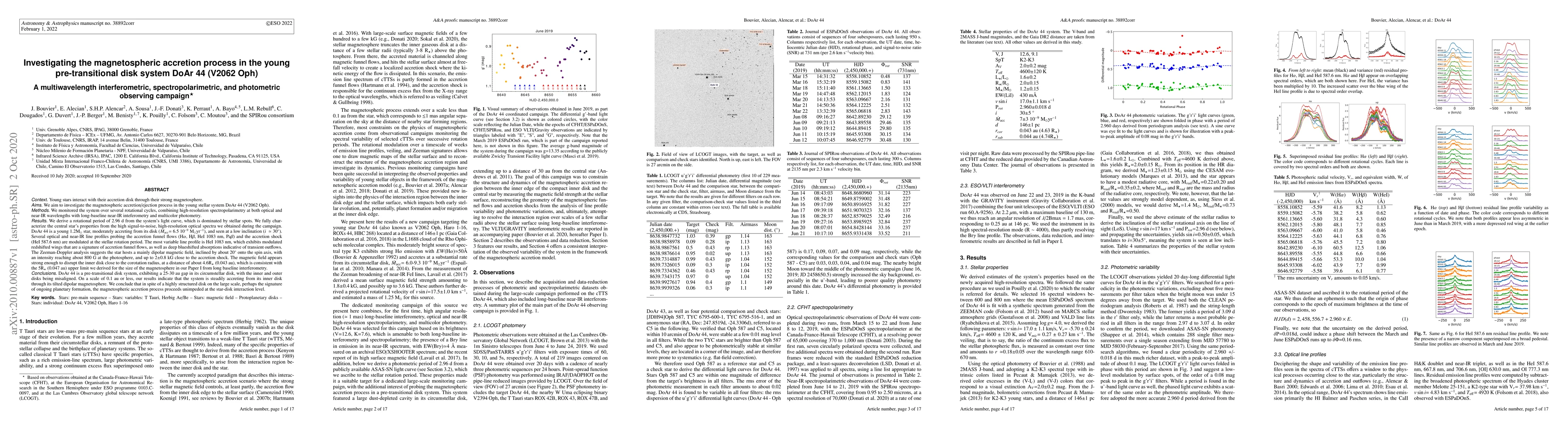 This study investigates the magnetospheric accretion process in the young pre-transitional disk system DoAr 44 using multiwavelength interferometry, spectropolarimetry, and photometry. The analysis reveals a strong dipolar magnetic field disrupting the inner disk and supporting steady accretion through the tilted magnetosphere, despite the complex outer disk structure.