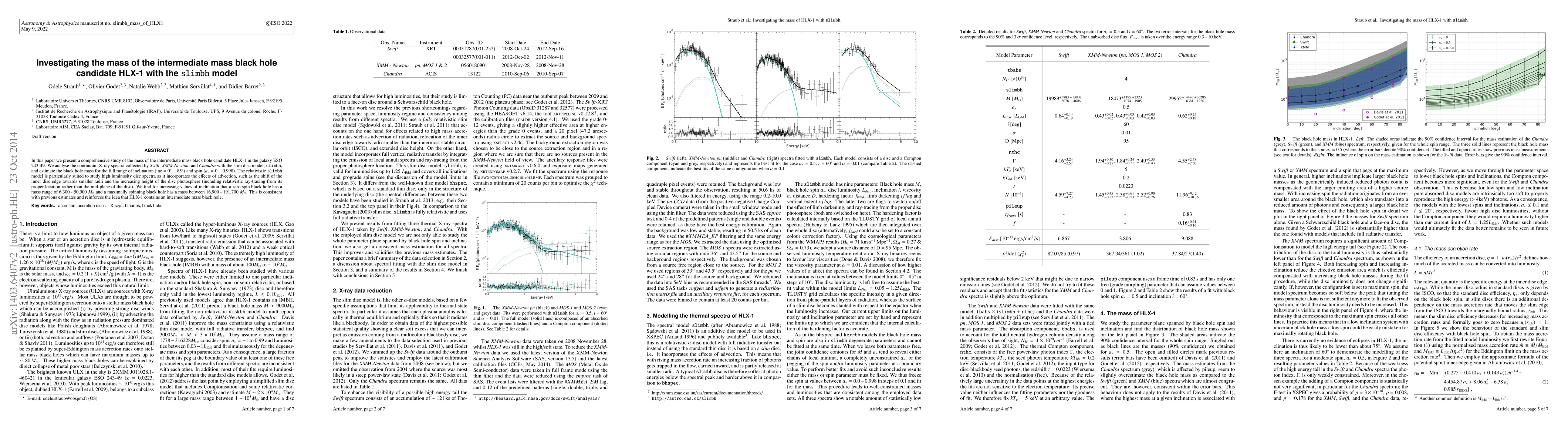 In this paper we present a comprehensive study of the mass of the intermediate mass black hole candidate HLX-1 in the galaxy ESO 243-49. We analyse the continuum X-ray spectra collected by Swift, XMM-Newton, and Chandra with the slim disc model, SLIMBH, and estimate the black hole mass for the full range of inclination (inc = 0{\deg} - 85{\deg}) and spin (a* = 0 - 0.998). The relativistic SLIMBH model is particularly suited to study high luminosity disc spectra as it incorporates the effects of advection, such as the shift of the inner disc edge towards smaller radii and the increasing height of the disc photosphere (including relativistic ray-tracing from its proper location rather than the mid-plane of the disc). We find for increasing values of inclination that a zero spin black hole has a mass range of 6,300 - 50,900 M_sun and a maximally spinning black hole has a mass between 16,900 - 191,700 M_sun. This is consistent with previous estimates and reinforces the idea that HLX-1 contains an intermediate mass black hole.