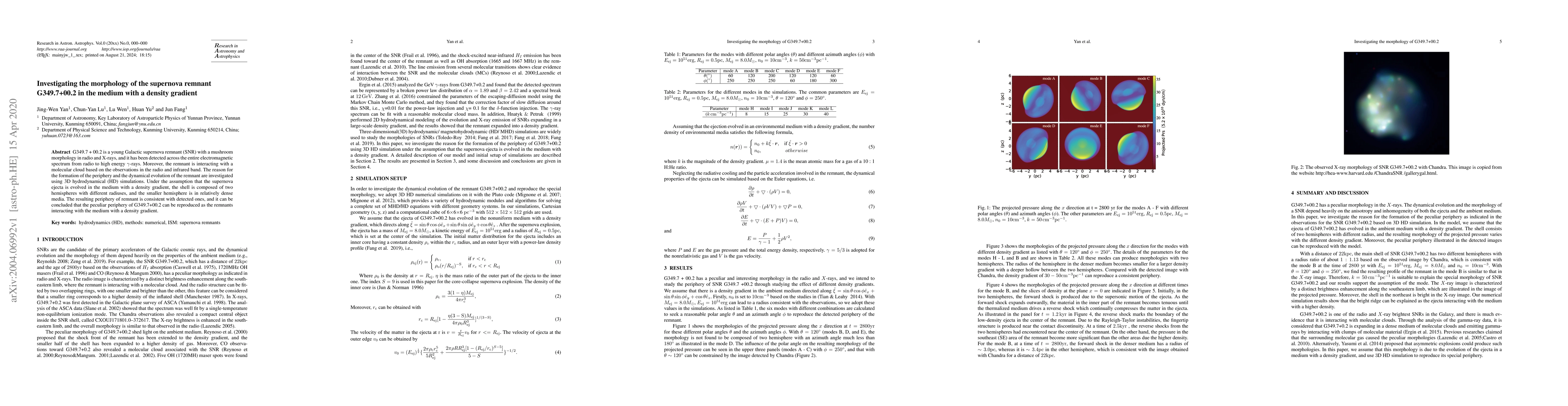 G349.7 + 00.2 is a young Galactic supernova remnant (SNR) with a mushroom morphology in radio and X-rays, and it has been detected across the entire electromagnetic spectrum from radio to high energy $\gamma$-rays. Moreover, the remnant is interacting with a molecular cloud based on the observations in the radio and infrared band. The reason for the formation of the periphery and the dynamical evolution of the remnant are investigated using 3D hydrodynamical (HD) simulations. Under the assumption that the supernova ejecta is evolved in the medium with a density gradient, the shell is composed of two hemispheres with different radiuses, and the smaller hemisphere is in relatively dense media. The resulting periphery of remnant is consistent with detected ones, and it can be concluded that the peculiar periphery of G349.7+00.2 can be reproduced as the remnants interacting with the medium with a density gradient.