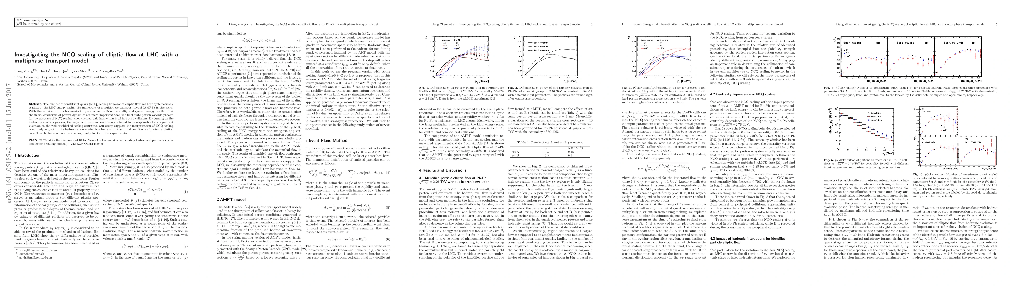 The number of constituent quark (NCQ) scaling behavior of elliptic flow has been systematically studied at the LHC energy within the framework of a multiphase transport model (AMPT) in this work. We find that the parameters used to generate the initial states and the collision centrality are important for the existence of NCQ scaling even when hadronic rescattering contribution is off in Pb-Pb collisions of $\sqrt{s_{NN}}=2.76$ TeV. By turning on the hadron rescattering process, the hadronic evolution impacts are also found to be significant. Extending the analysis to Pb-Pb collsions of $\sqrt{s_{NN}}=5.02$ TeV, one would observe similar qualitative features.