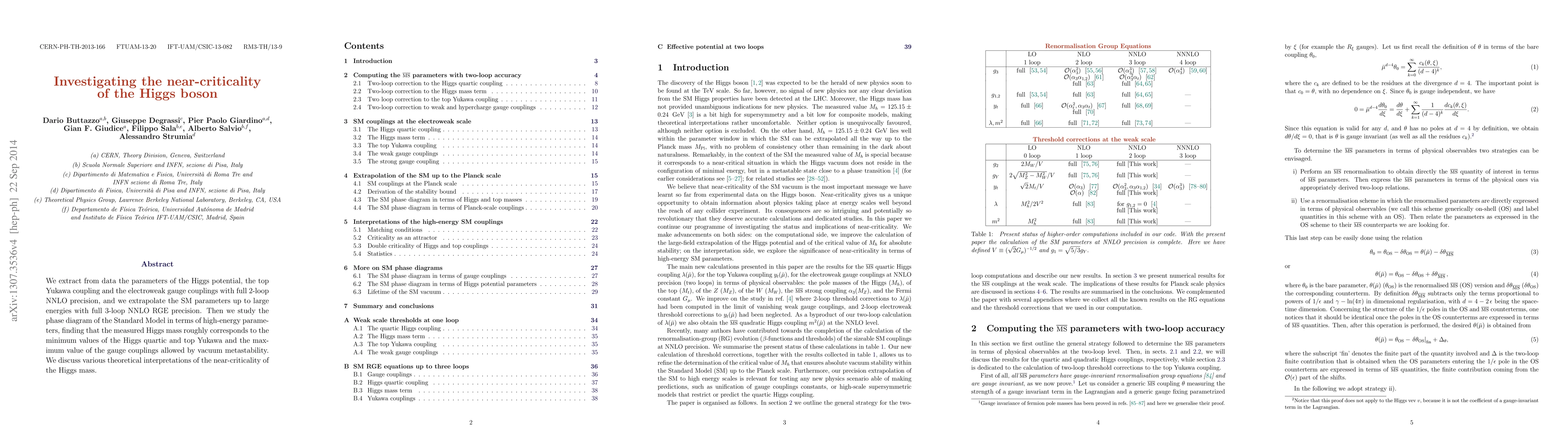 We extract from data the parameters of the Higgs potential, the top Yukawa coupling and the electroweak gauge couplings with full 2-loop NNLO precision, and we extrapolate the SM parameters up to large energies with full 3-loop NNLO RGE precision. Then we study the phase diagram of the Standard Model in terms of high-energy parameters, finding that the measured Higgs mass roughly corresponds to the minimum values of the Higgs quartic and top Yukawa and the maximum value of the gauge couplings allowed by vacuum metastability. We discuss various theoretical interpretations of the near-criticality of the Higgs mass.