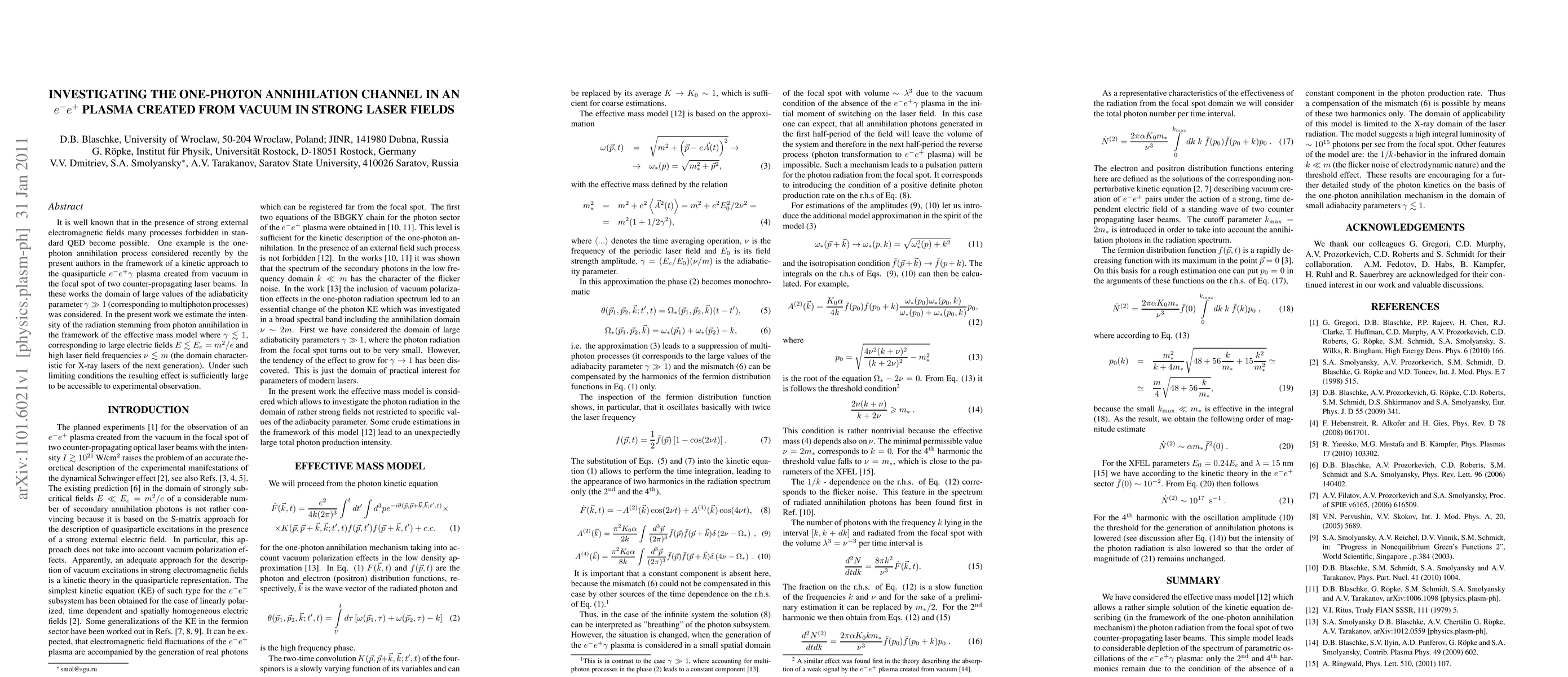It is well known that in the presence of strong external electromagnetic fields many processes forbidden in standard QED become possible. One example is the one-photon annihilation process considered recently by the present authors in the framework of a kinetic approach to the quasiparticle e-e+ gamma plasma created from vacuum in the focal spot of two counter-propagating laser beams. In these works the domain of large values of the adiabaticity parameter gamma >> 1 (corresponding to multiphoton processes) was considered. In the present work we estimate the intensity of the radiation stemming from photon annihilation in the framework of the effective mass model where gamma < 1, corresponding to large electric fields E < E_c=m^2/e and high laser field frequencies (the domain characteristic for X-ray lasers of the next generation). Under such limiting conditions the resulting effect is sufficiently large to be accessible to experimental observation.