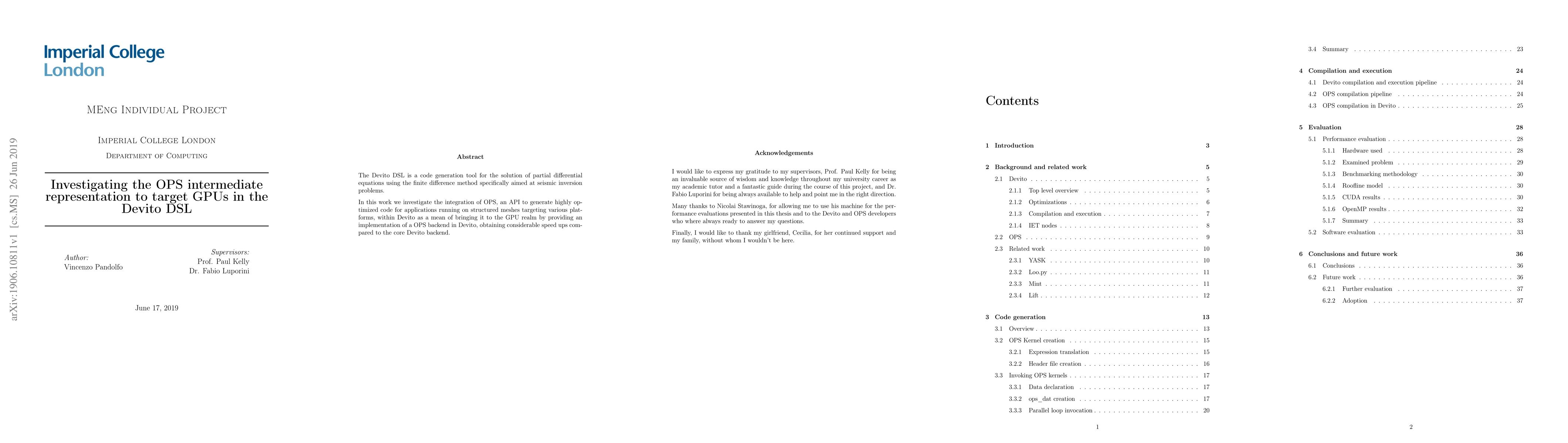 This paper investigates integrating the OPS API into the Devito DSL to optimize GPU performance for solving partial differential equations, achieving significant speedups over the core Devito backend. The focus is on enhancing seismic inversion problems through efficient GPU code generation.
